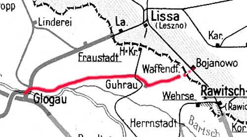 Bojanowo 0,0 - Grenze Polen/Deutschland 3,409 (Streckenunterbrechung) - Streckenanfang km 5,08 - Waffendorf 5,34 - Guhrau 15,17 - Abzw Alte Oder (Ao) 50,03 - Glogau 51,57 (1938)