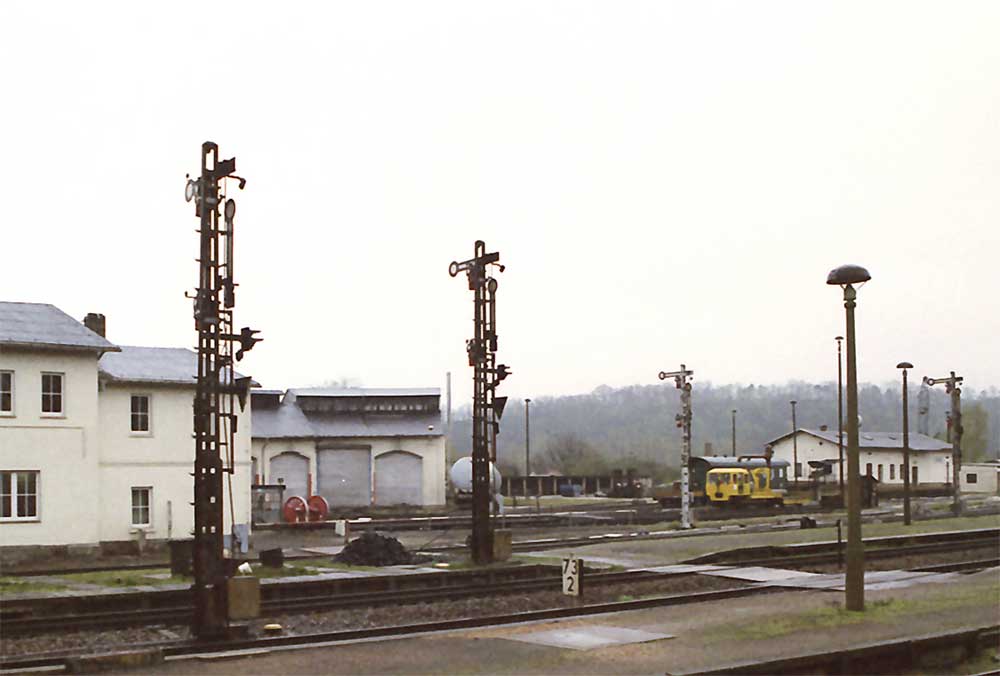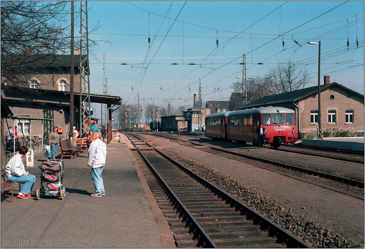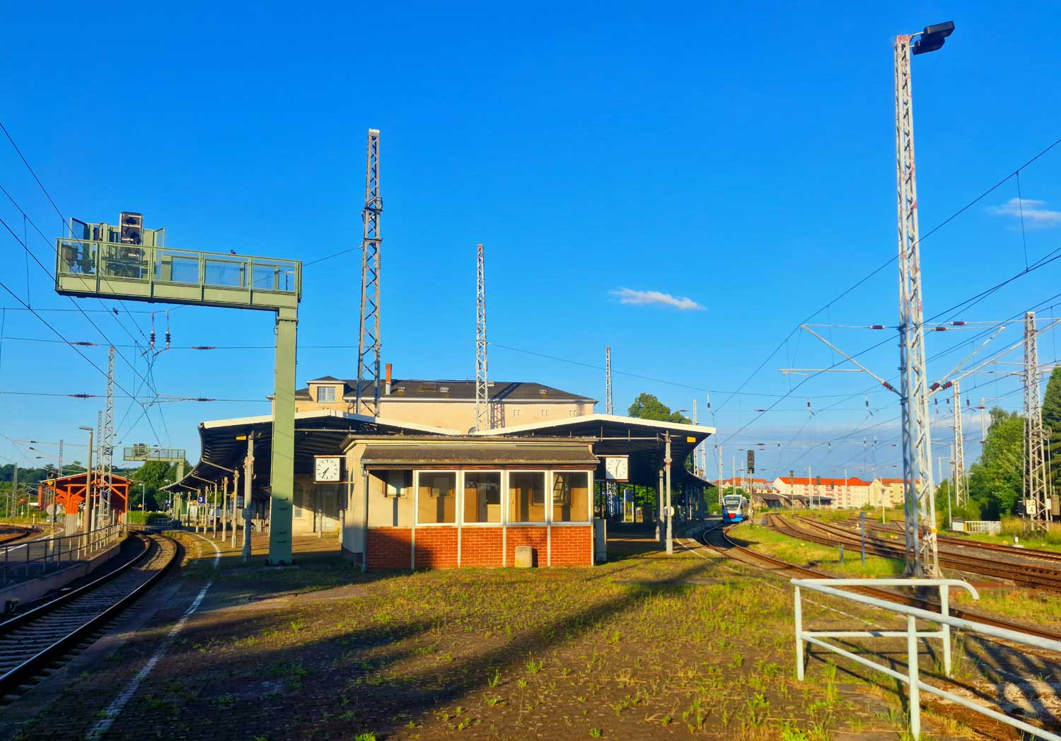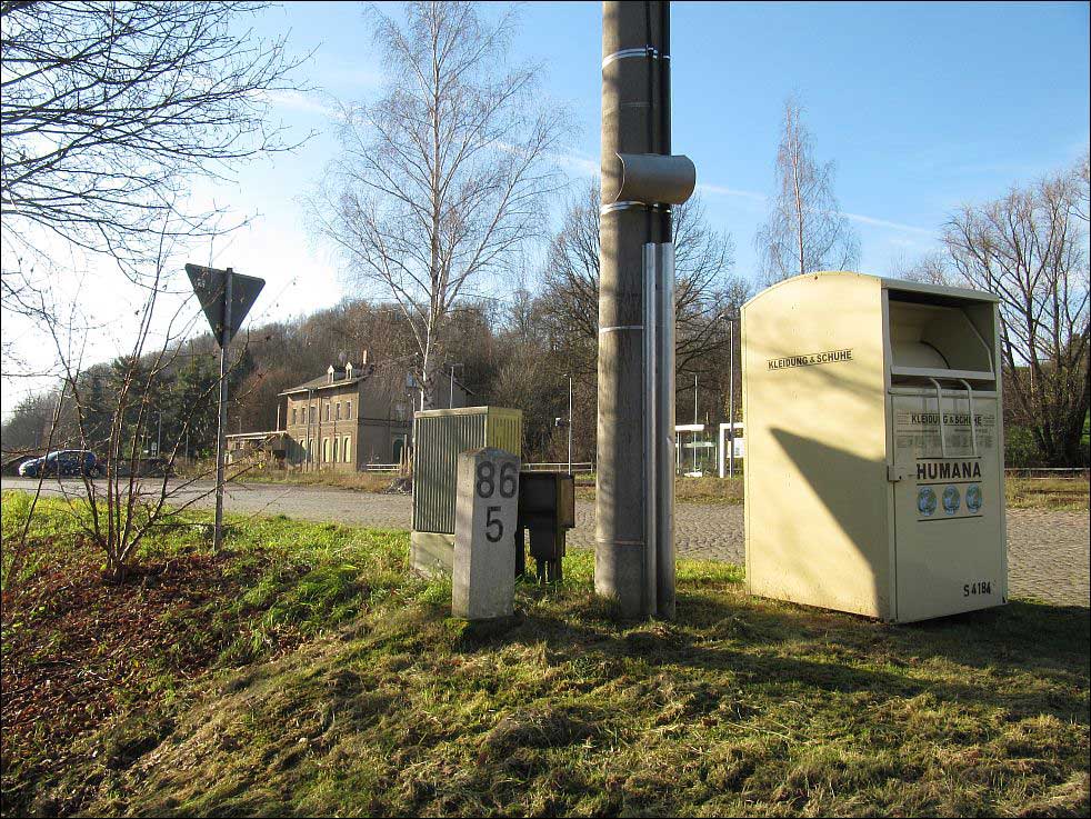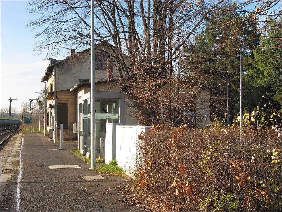 Man beachte auch die schiefstehende Lampe vor dem Bahnhofsgebäude.