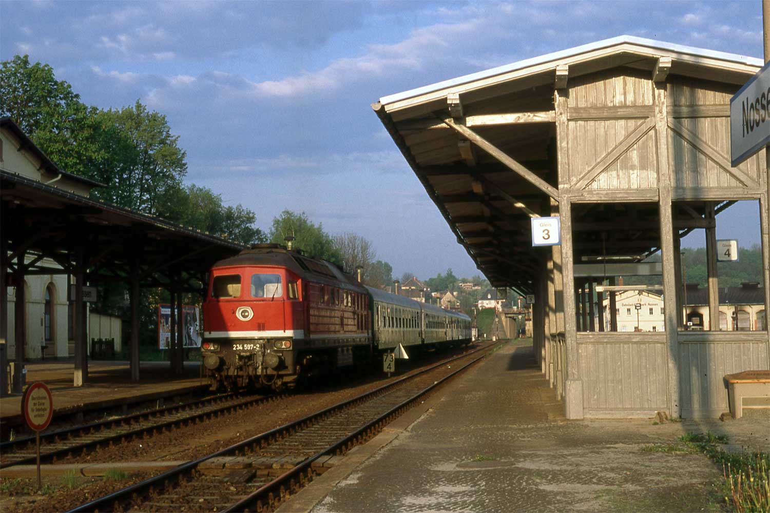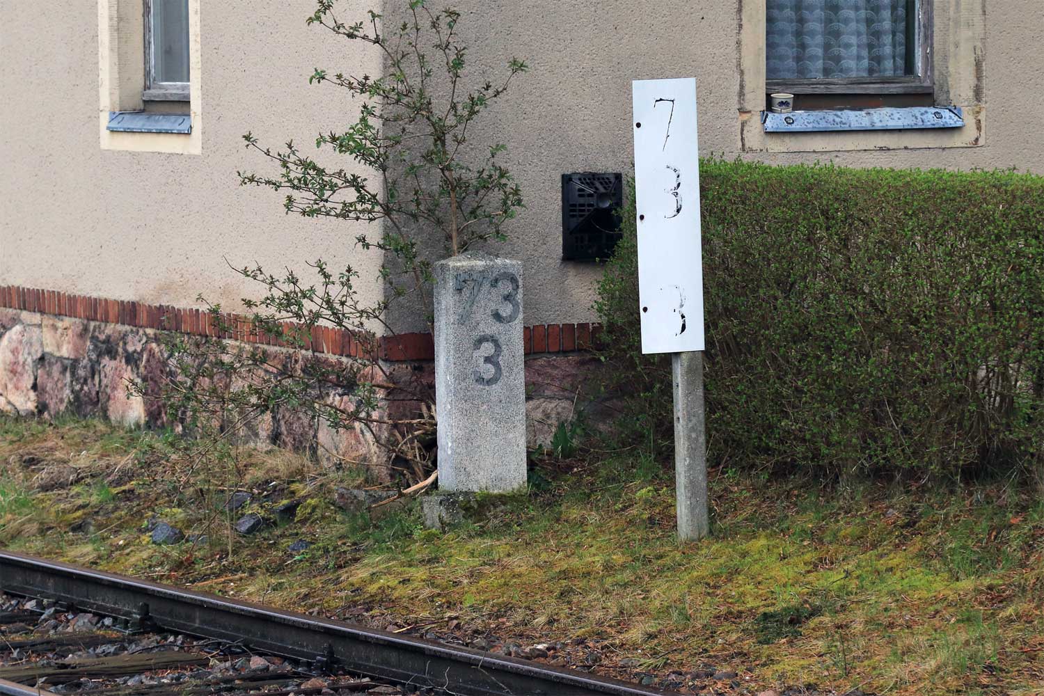 Nossen | 73,41 | km 0,0 der Strecke Nossen 0,0 - Freiberg (Sachs) 23,97 - Staatsgrenze Deutschland/Tschechien - Moldava (dt.: Moldau) 63,40 (NM) |