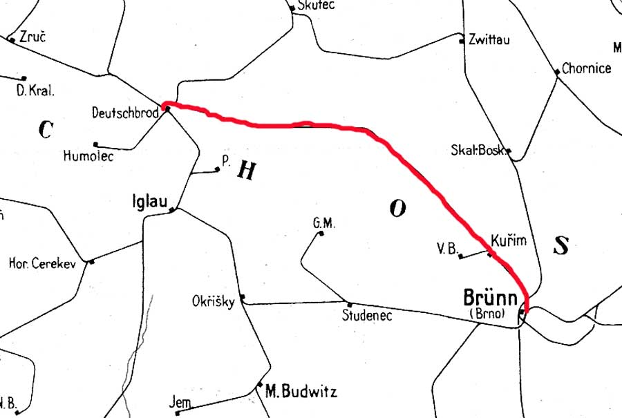 Schimitz Haltestelle / Židenice zastávka 0,201 - Gurein / Kuřim 18,655 - Tischnowitz / Tišnov 30,041 - Deutsch Brod / Německý Brod 118,413