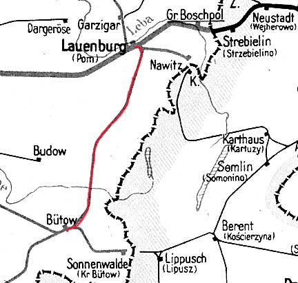 Lauenburg (Pom) | 55,13 | km 422,84 der Strecke Berlin Stettiner Bf -0,28 - Stettin Hbf 134,41 - Belgard 280,01 - Stolp 371,46 - Gr. Boschpol 439,03 - Reichsgrenze Deutschland/Polnischer Korridor km 442,275 = km 92,994 - Danzig Hbf 32,69 - Dirschau 0,0 |