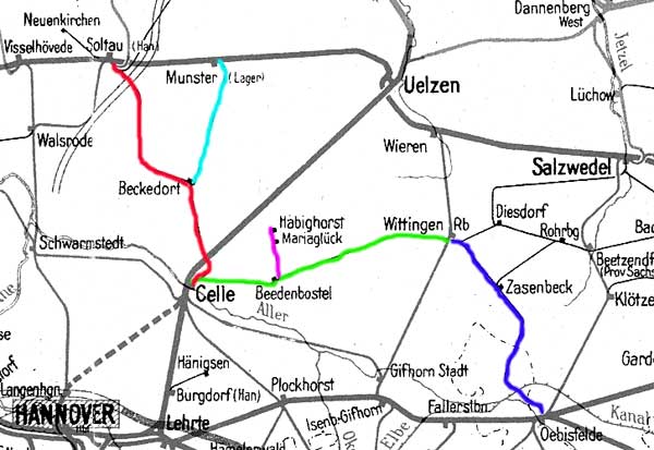 Celle Nord 0,0 - Beckedorf 26,7 - Soltau (Han) Süd 58,9 - [Soltau (Han) 59,3] [Osthannoverschen Eisenbahnen (OHE)]