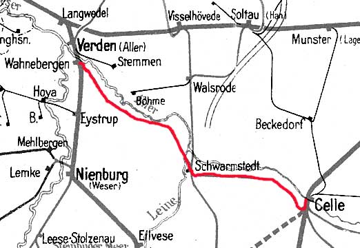 Celle 0,0 km 44,10 der Strecke Hannover Hbf 0,0 - Lehrte 16,36 - Celle 44,10 - Lüneburg 131,56 - Hamburg-Harburg 169,37 - Cuxhaven Stadt 273,05 mit Abzweig nach Cuxhaven Hafen (Amerikahafen) 274,23