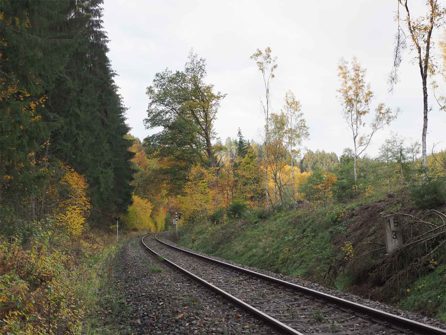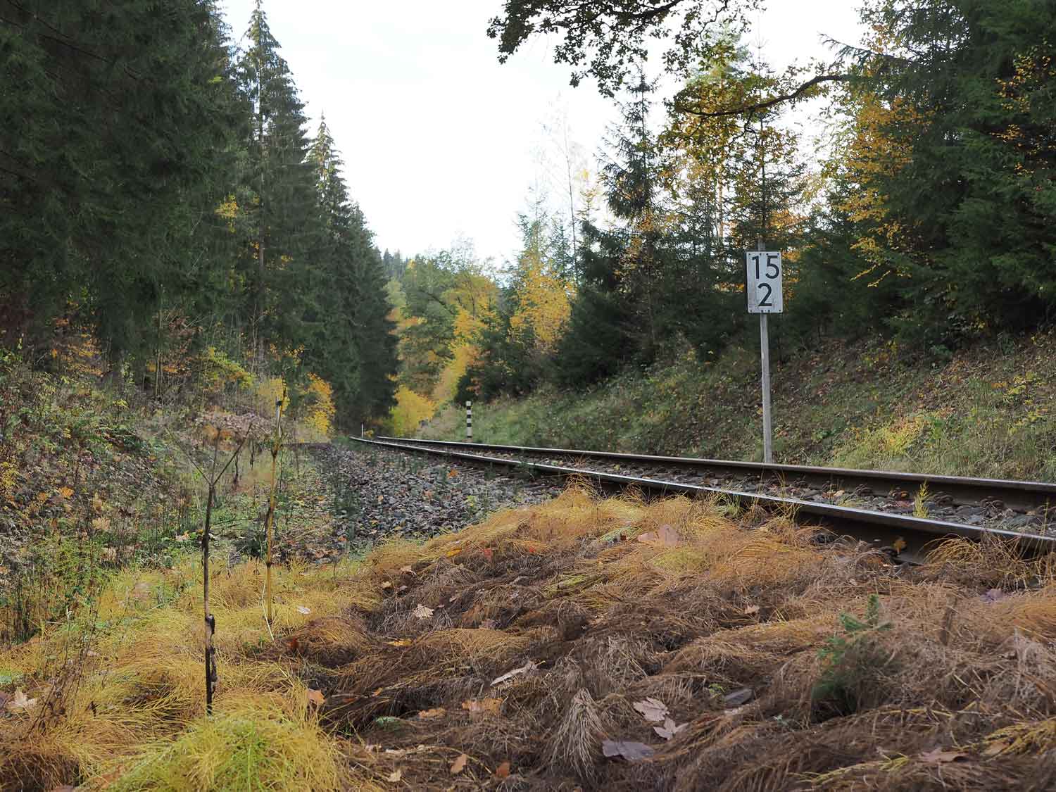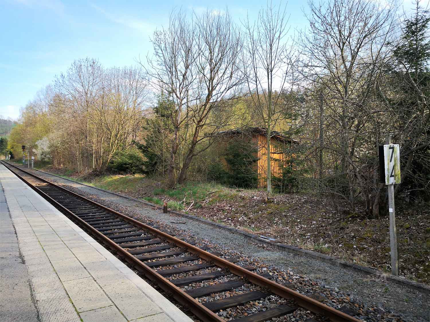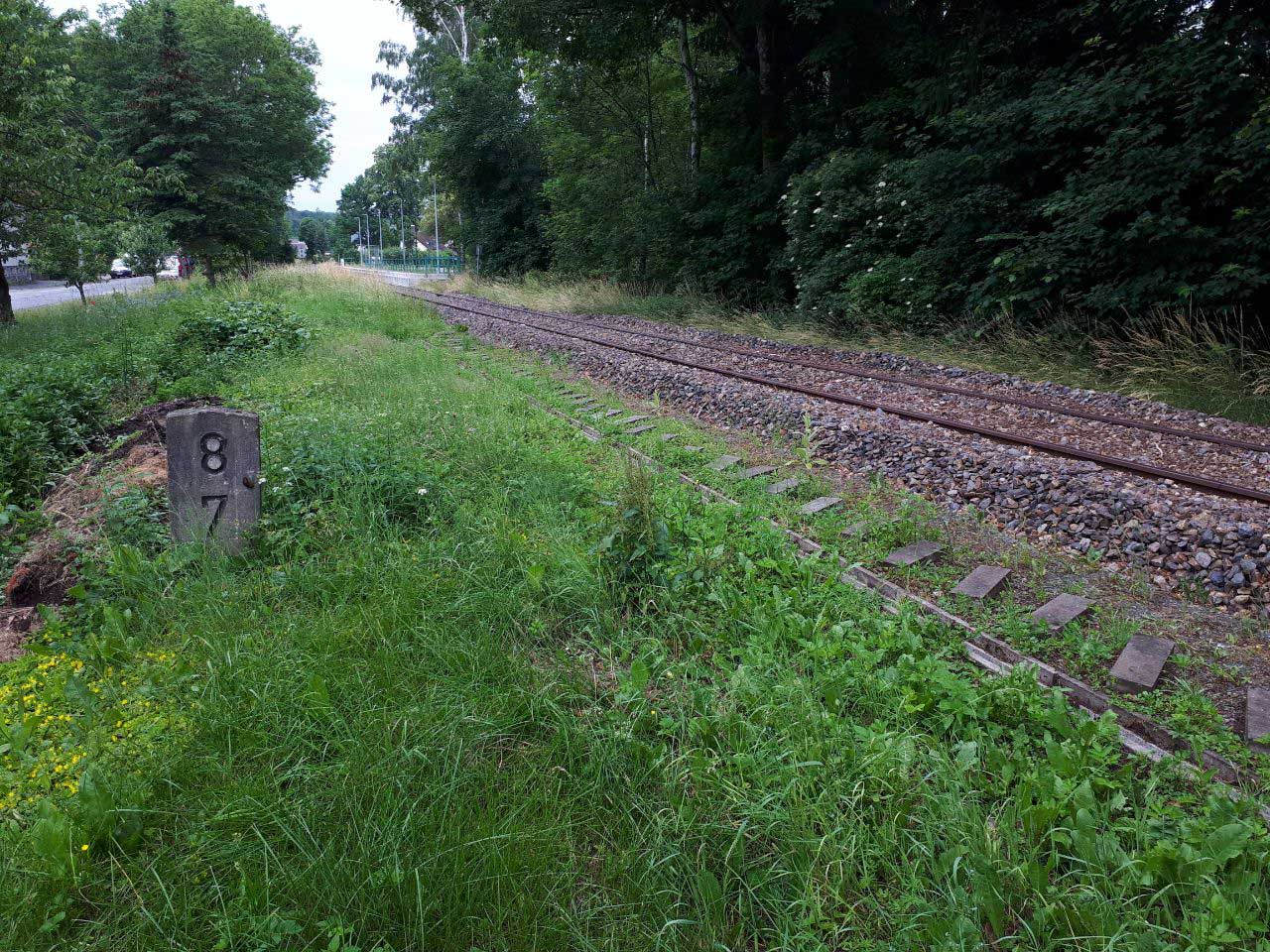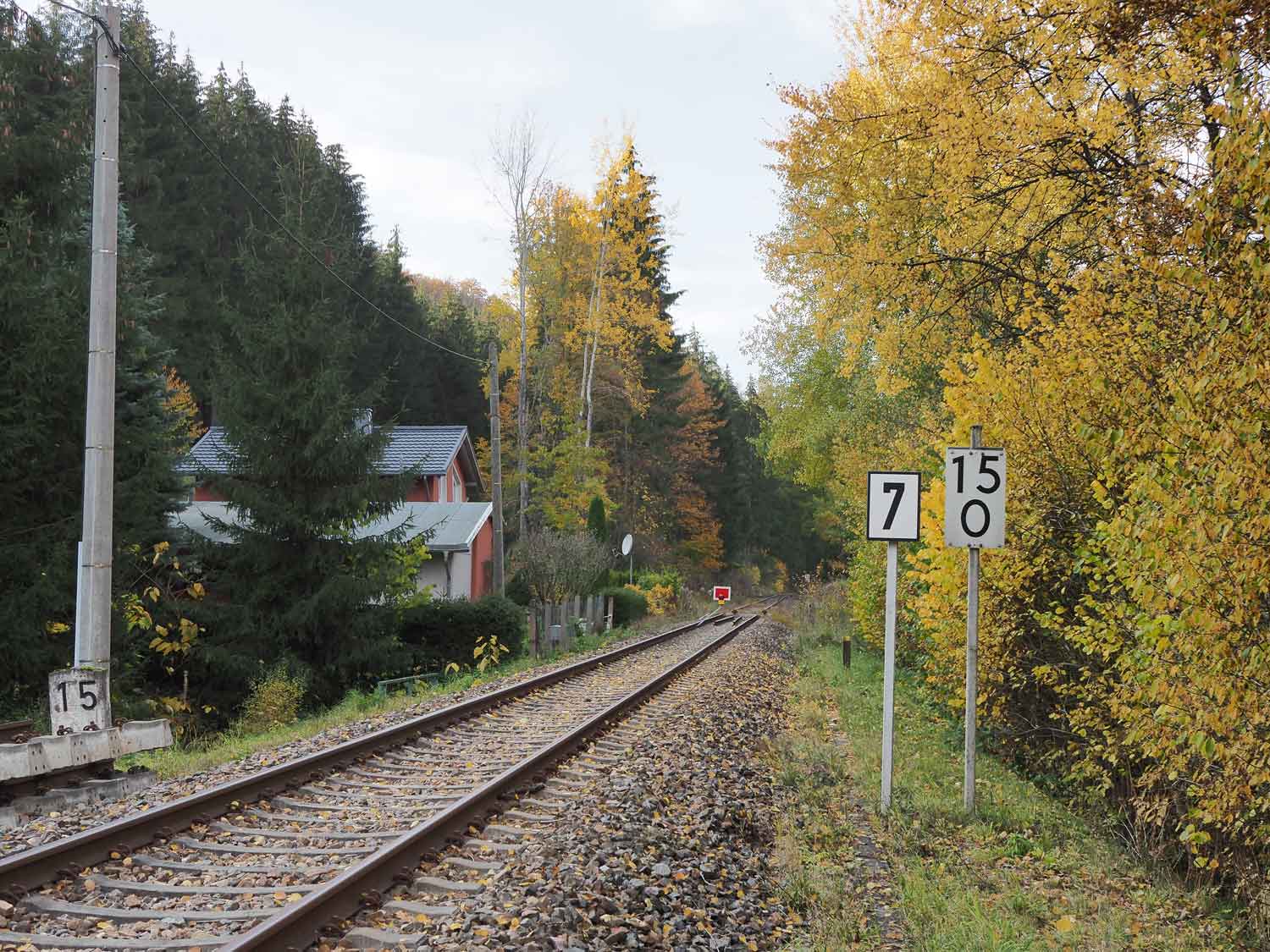 km 34,30 der Strecke Wilkau-Haßlau -0,21 - Schönheide Süd 34,303 - Carlsfeld 41,634 (WCd) Spurweite 750 mm | ||