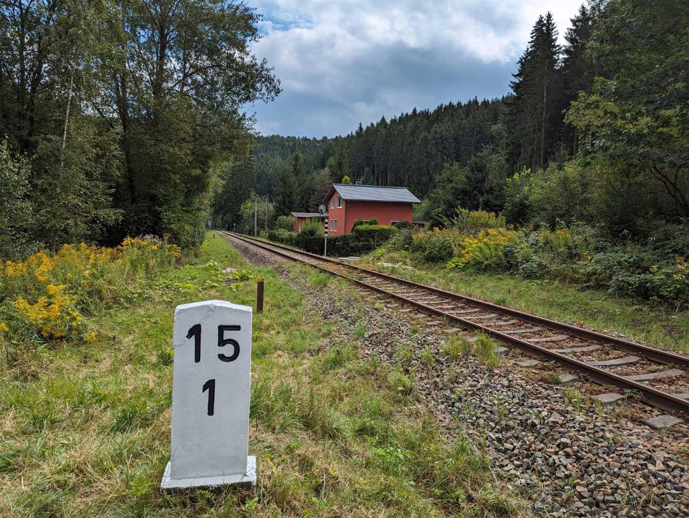 km 13,8 (Stein und Tafel) zwischen Dittersdorf (bei Chemnitz) und Kemtau - Blick Richtung Aue