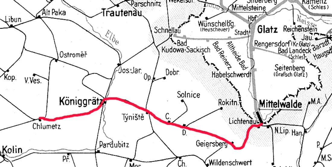Chlumetz an der Zidlina 0,0 - Königsgrätz 27,96 - Tinischt 49,78 - Gabel an der Adler 99,27 - Grenze Protektorat Böhmen und Mähren/Sudetenland 100,89 - Lichtenau 110,82 - Grenze Sudetenland/Schlesien 113,24 =