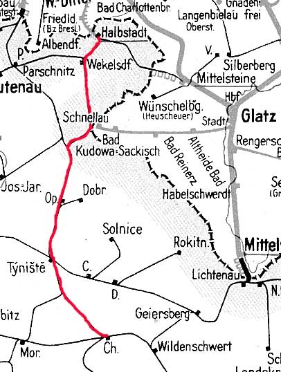 Grenze Protektorat/Sudetenland 77,06 - Weckelsdorf (Teplice nad Metují) 82,42 - Halbstadt (Meziměstí) 90,84