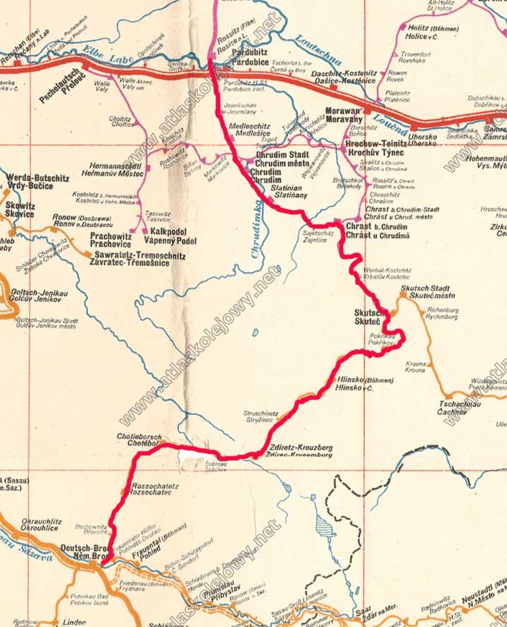 Deutsch Brod / Německý Brod 0,195 - Skutsch / Skuteč 55,095 - Chrast b/Chrudim / Chrast u Chrudimě 68,515 - Chrudim / Chrudim 80,513 - Rossitz (Elbe) / Rosice nad Labem 92,450