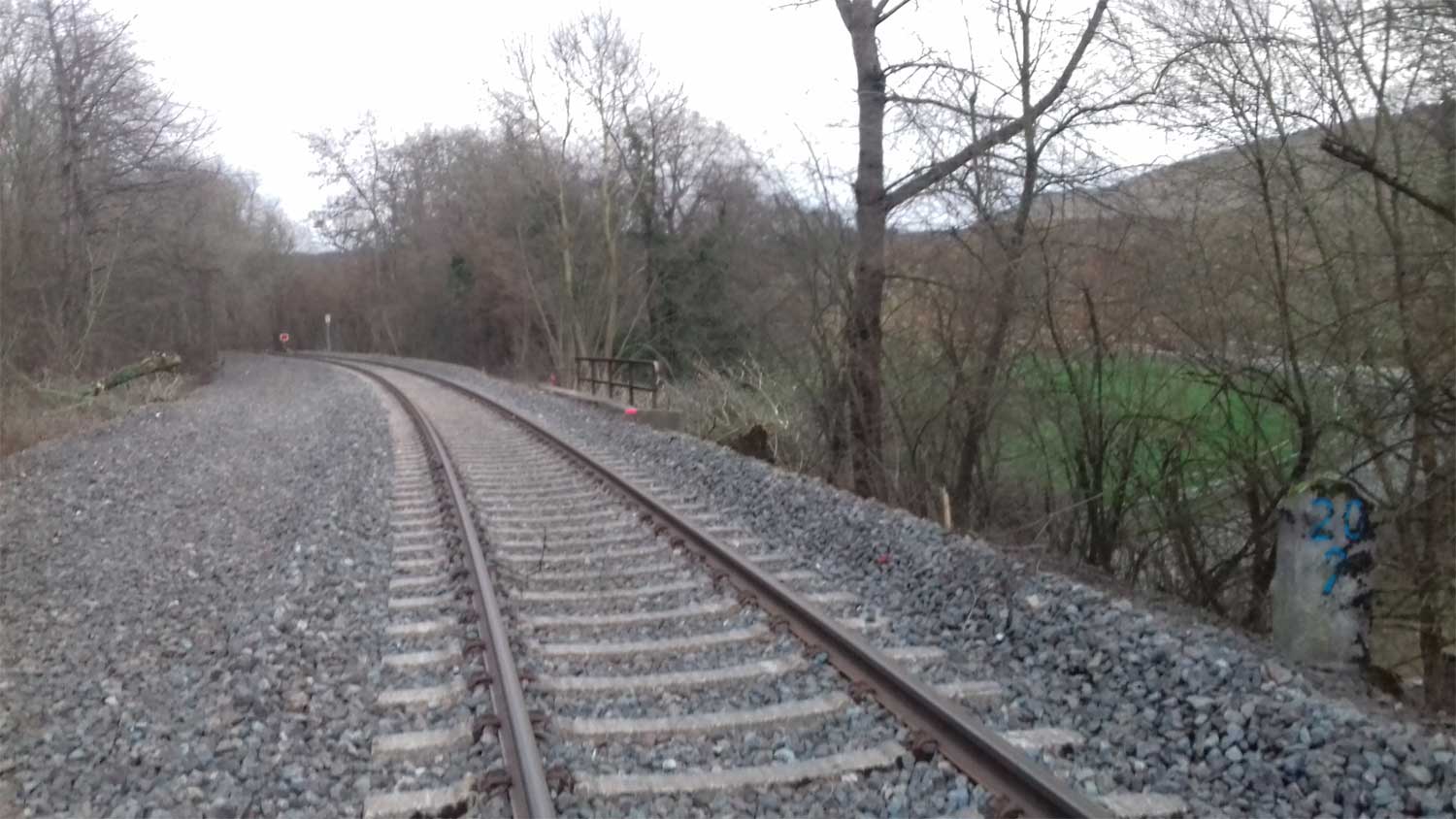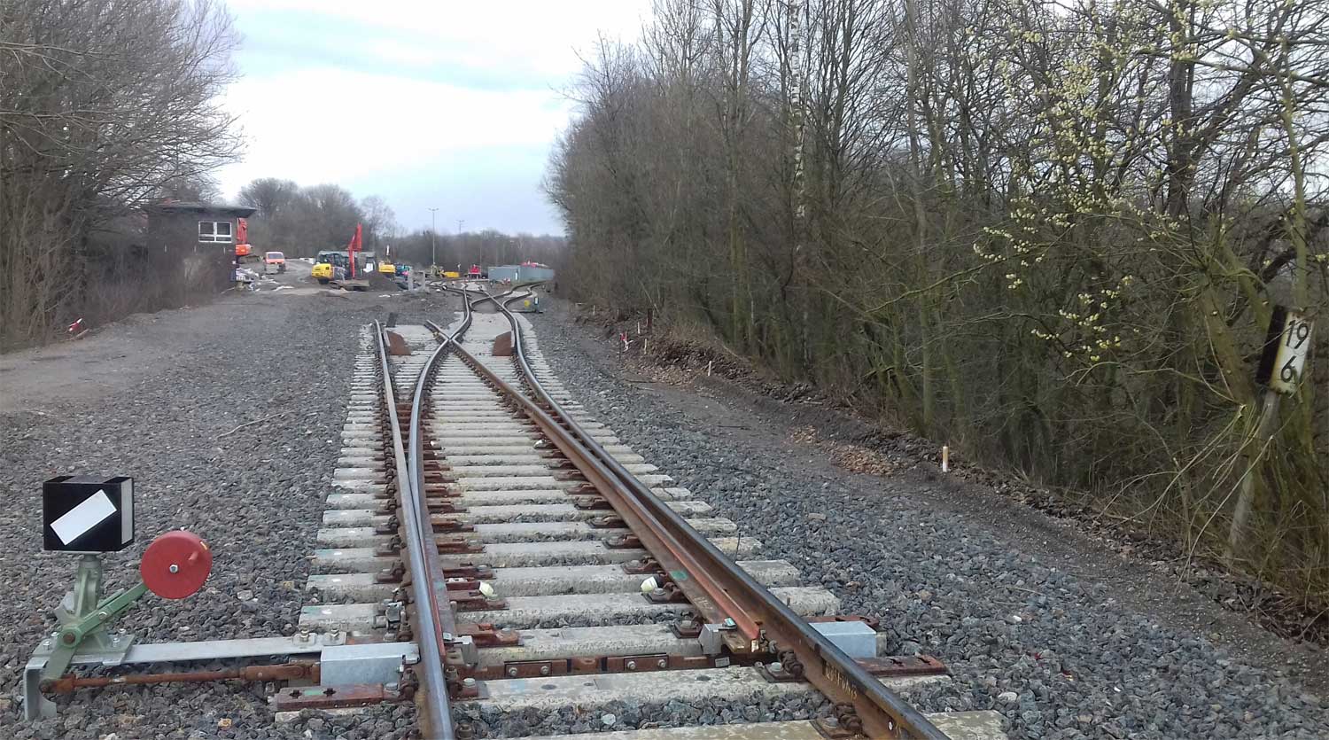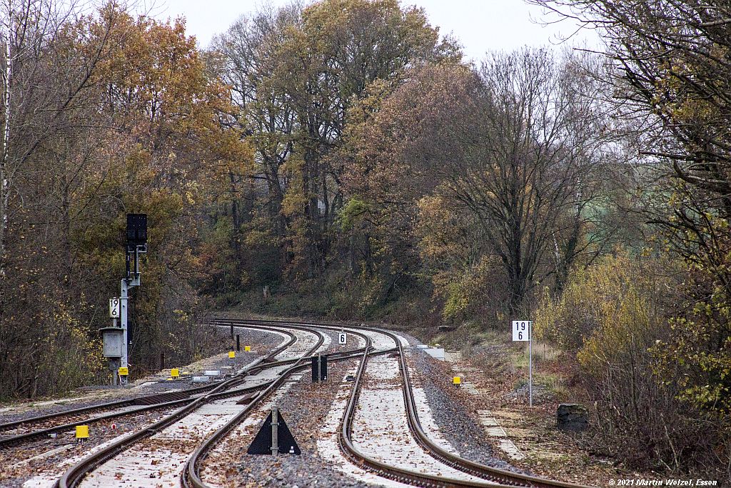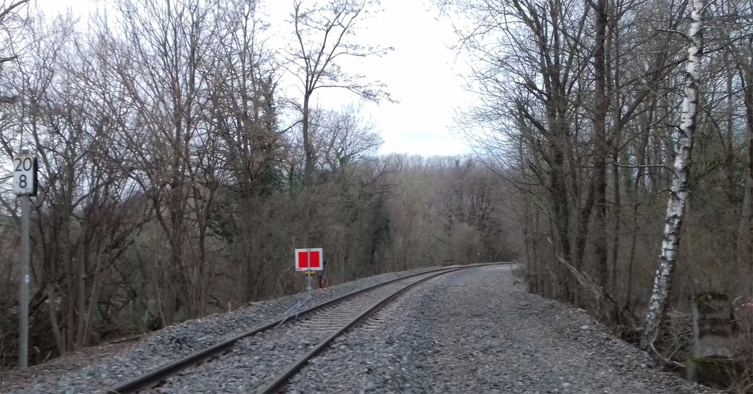 km 19,6 (Tafel rechts) in Dornap-Hahnenfurt - Blick Richtung Streckenanfang bei km 19,594 (Weiche)
