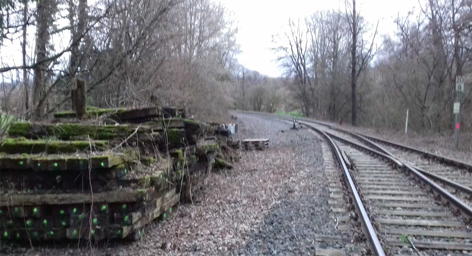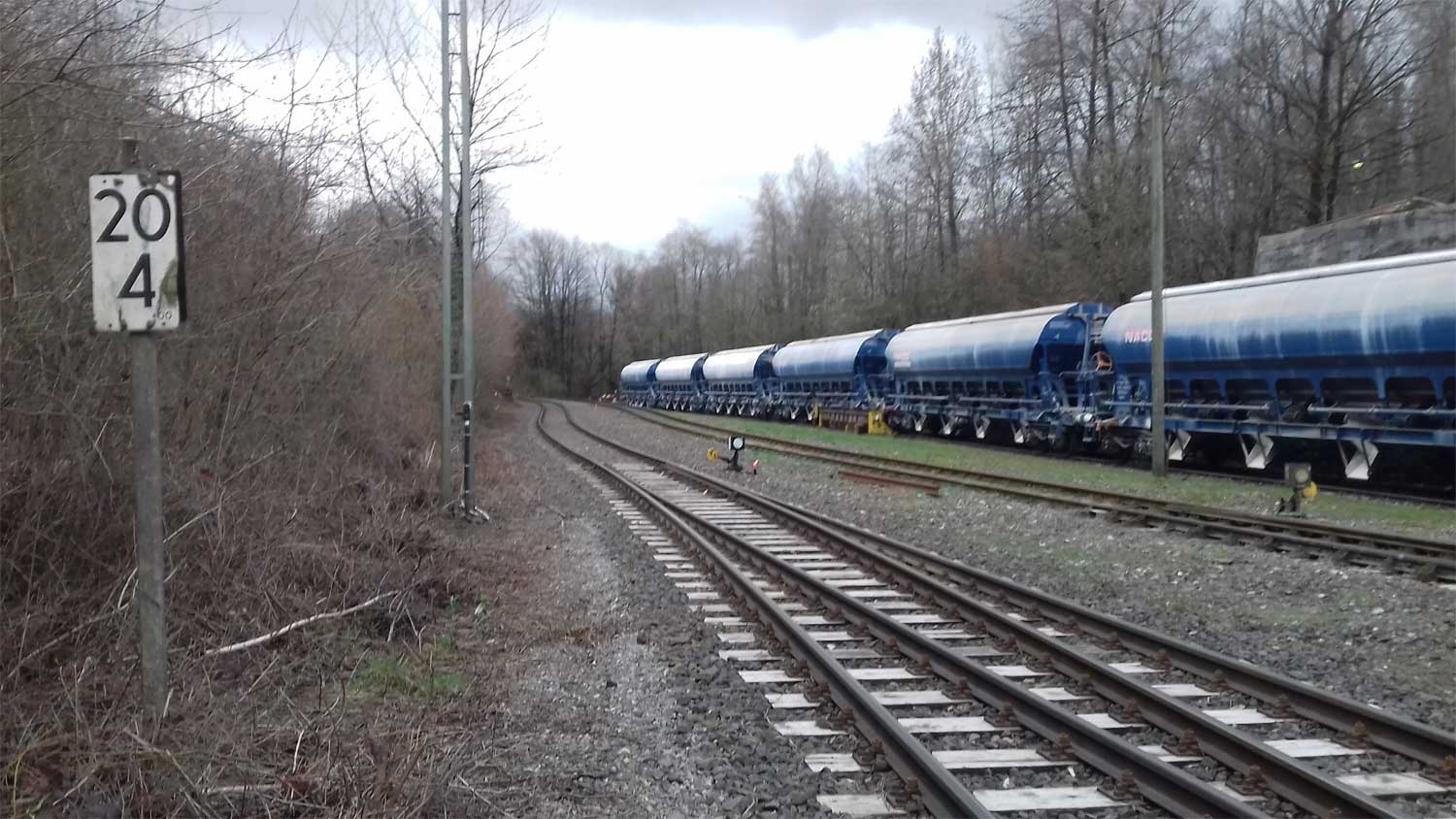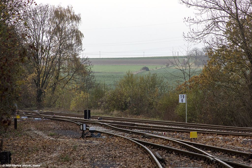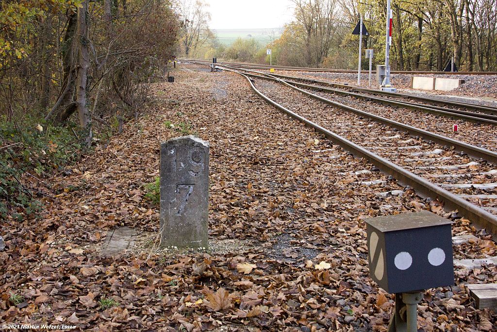 km 19,6 (Tafel rechts) in Dornap-Hahnenfurt - Blick Richtung Streckenanfang bei km 19,594 (Weiche)