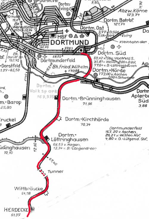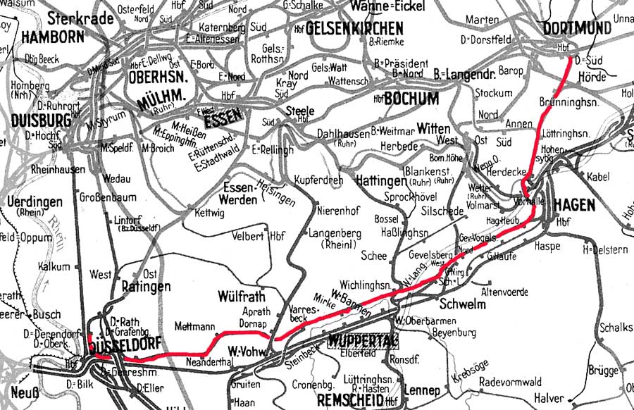 Düsseldorf-Derendorf 0,0 - Abzw De 2,02 = 0,0 - Düsseldorf-Gerresheim 4,96 - Mettmann 15,46 - Wichlinghausen 34,26 - Hagen-Heubing 52,61 - Herdecke 61,97 - Dortmund-Löttringshausen 68,53 - Dortmund Süd 77,64 [heute: Westfalenhalle (Dortmund) 73,80] (1951)