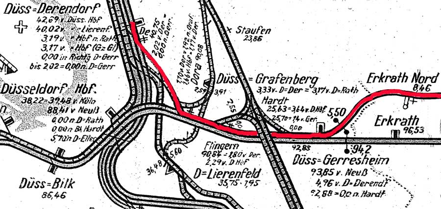 km 0,0 der Strecke Abzw Gerresheim 0,0 - Abzw Hardt 1,40 (= km 25,70 der Strecke Mülheim (Ruhr)-Speldorf 0,18 - Duisburg-Wedau 5,70 - Opladen 48,06 - Köln-Kalk Nord 63,17 - Troisdorf 81,19 Neuwied 135,81 - km 154,66 (vor Niederlahnstein) = [km 125,70 - Frankfurt (Main) Hbf 0,0] (siehe auch Tabelle 3, Ziffer 2) | ||