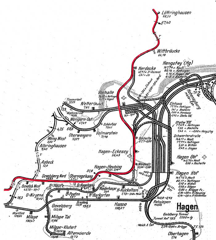 km 0,0 der Strecke Abzw Bechelte 0,0 - Abzw Einhaus 1,61 - Hagen-Hengstey 4,13 - Abzw Hohensyburg 5,77 | ||