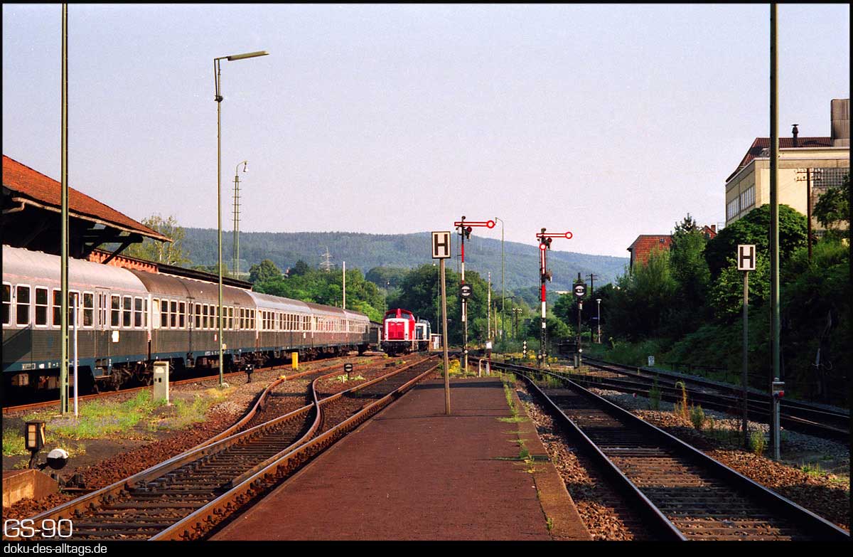 Hanau Hbf 88,15 km 22,97 der Strecke Frankfurt (Main) Hbf 0,0 - Hanau Hbf 22,97 - Schlüchtern 74,34 - (bis 1913: Elm 82,0 - Flieden 92,3) - (ab 1913 Distelrasentunnel) Flieden 85,240 = 92,195 (siehe auch Tabelle 5, Ziffer 3) - Fulda 110,57 - Bebra 166,667 - Eichenberg 227,37 - Göttingen 247,11