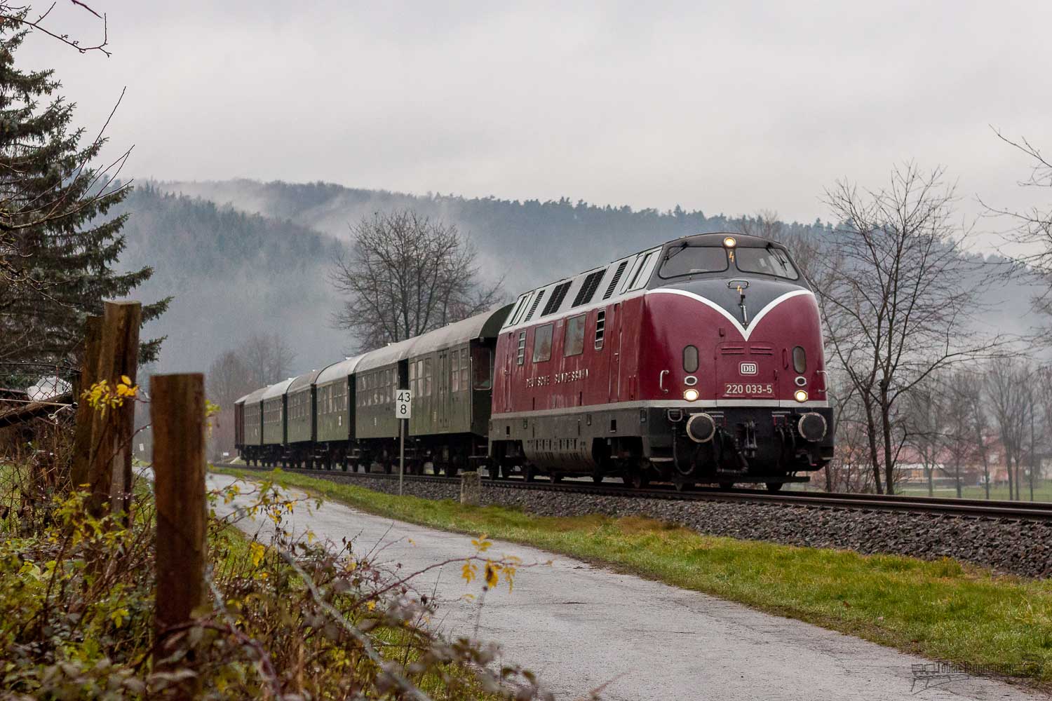 km 43,8 (Tafel und Stein) zwischen Bad König und Mümling-Grumbach - 220 033 (V200 033) der Eisenbahnfreunde Hamm