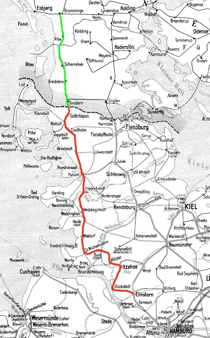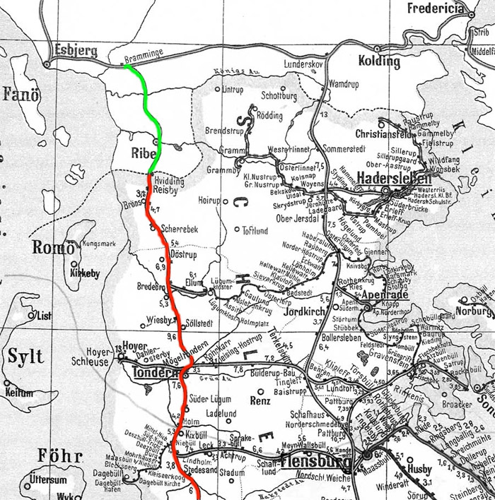 Tondern (Tønder) | 179,19 | km 0,0 der Strecke Tondern (heute: Tønder) 0,0 - Hoyerschleuse (heute: Højer Sluse) 13,78 (weiter mit Fähre zur Insel Sylt) |