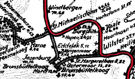 St.Michaelisdonn | 64,66 | km 0,0 der Strecke St Michaelisdonn 0,0 - Marne 8,26 = km 0,0 - Kronprinzenkoog Mittel 4,80 - Friedrichskoog III 12,46 |