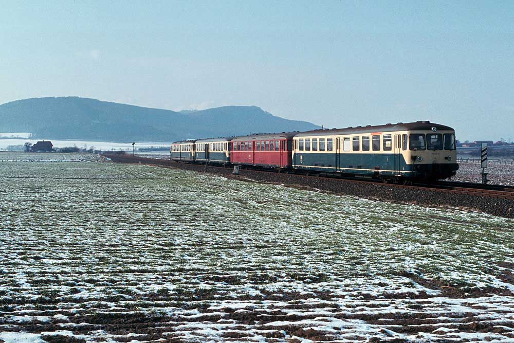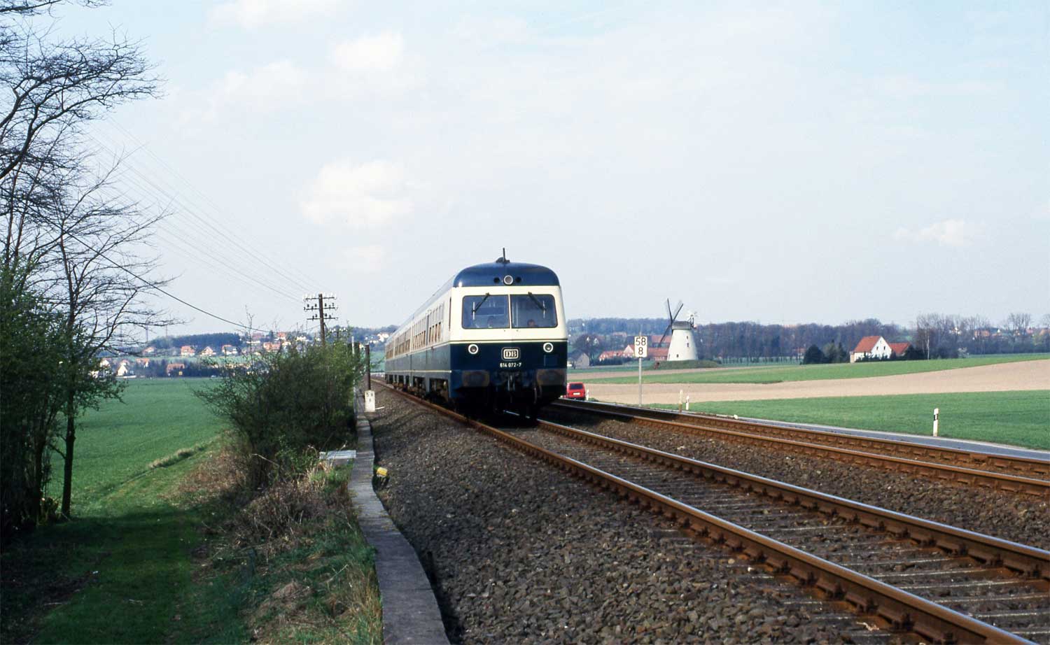 km 58,8 (Stein und Tafel) bei Eisbergen - 614 072 + 914 033 + 614 071 mit Windmühle