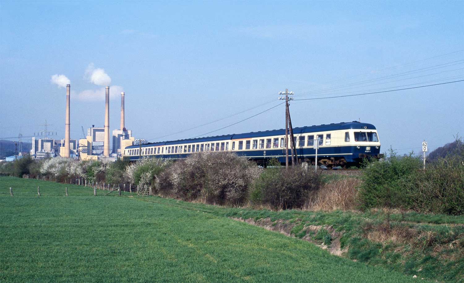km 62,0 (Stein und Tafel) bei Veltheim (b Rinteln) - 614 077 + 914 031 + 614 078 als E3711 mit Kraftwerk