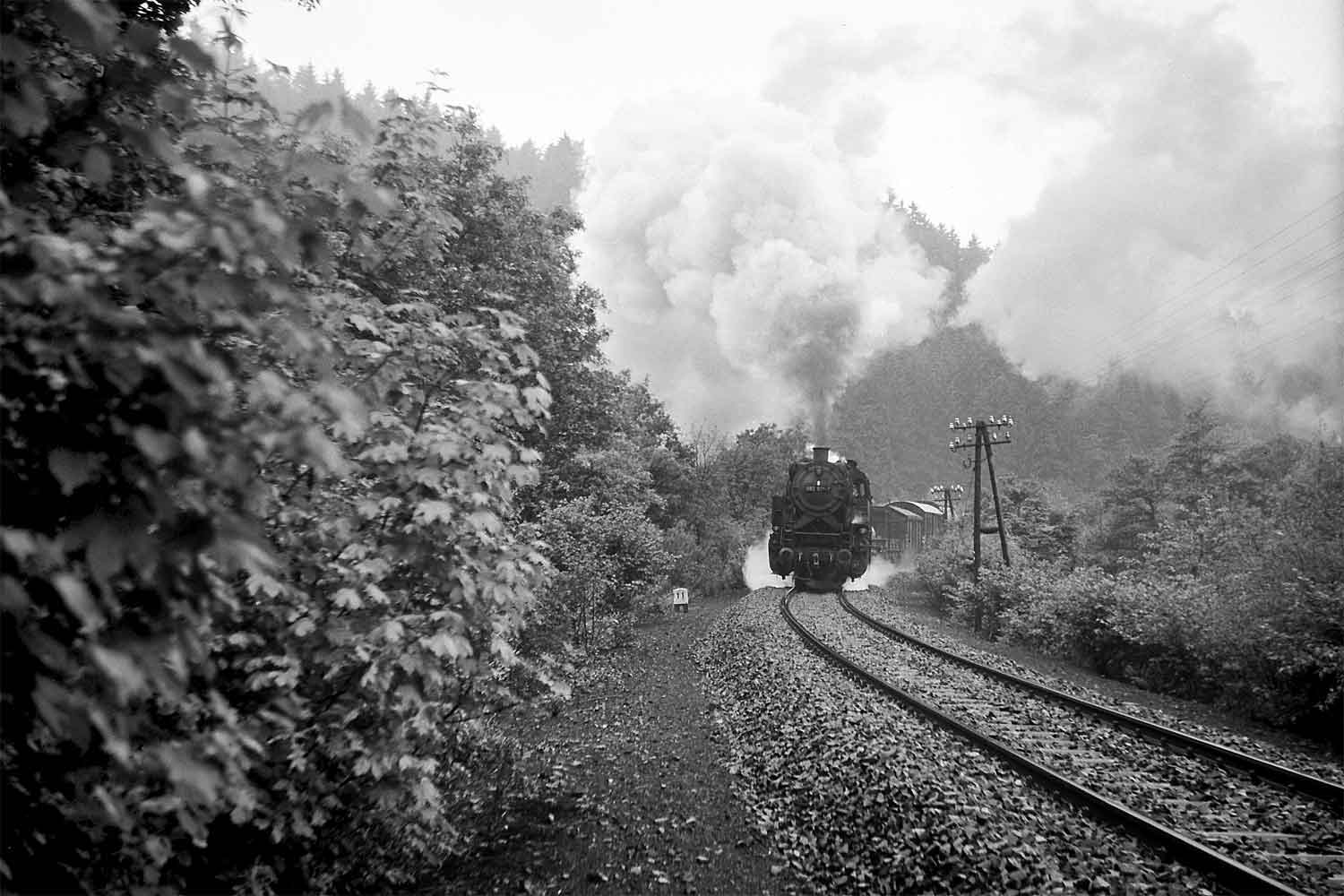 km 11,0 vor Grenzau - 082 021 (Bw Koblenz-Mosel) müht sich mit einem Güterzug - Blick Richtung Engers