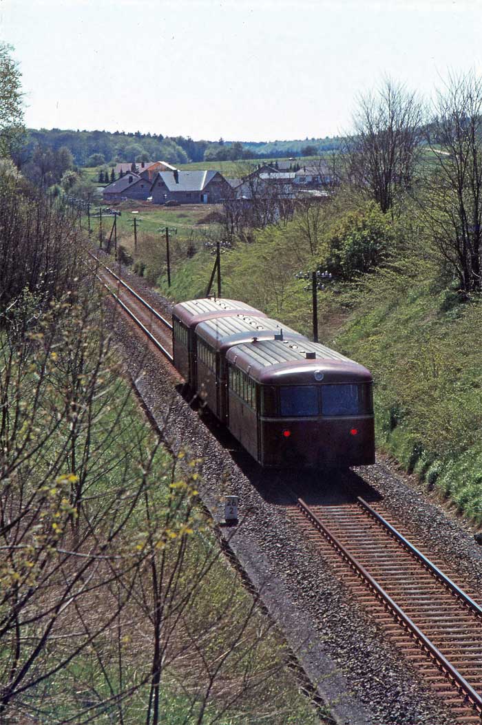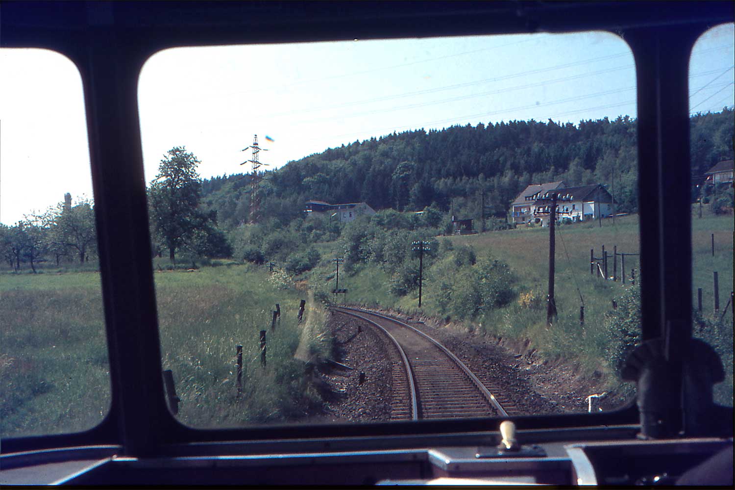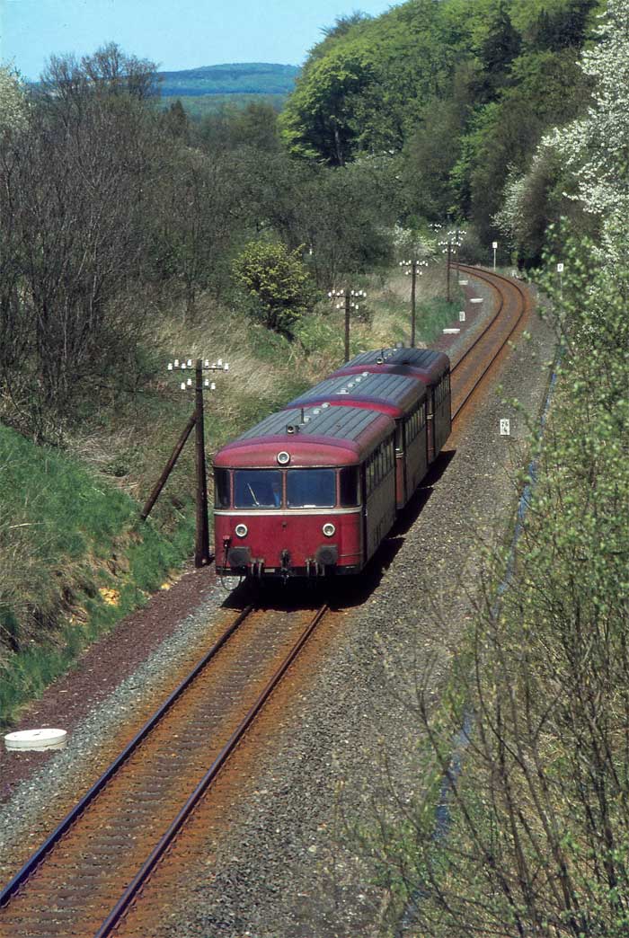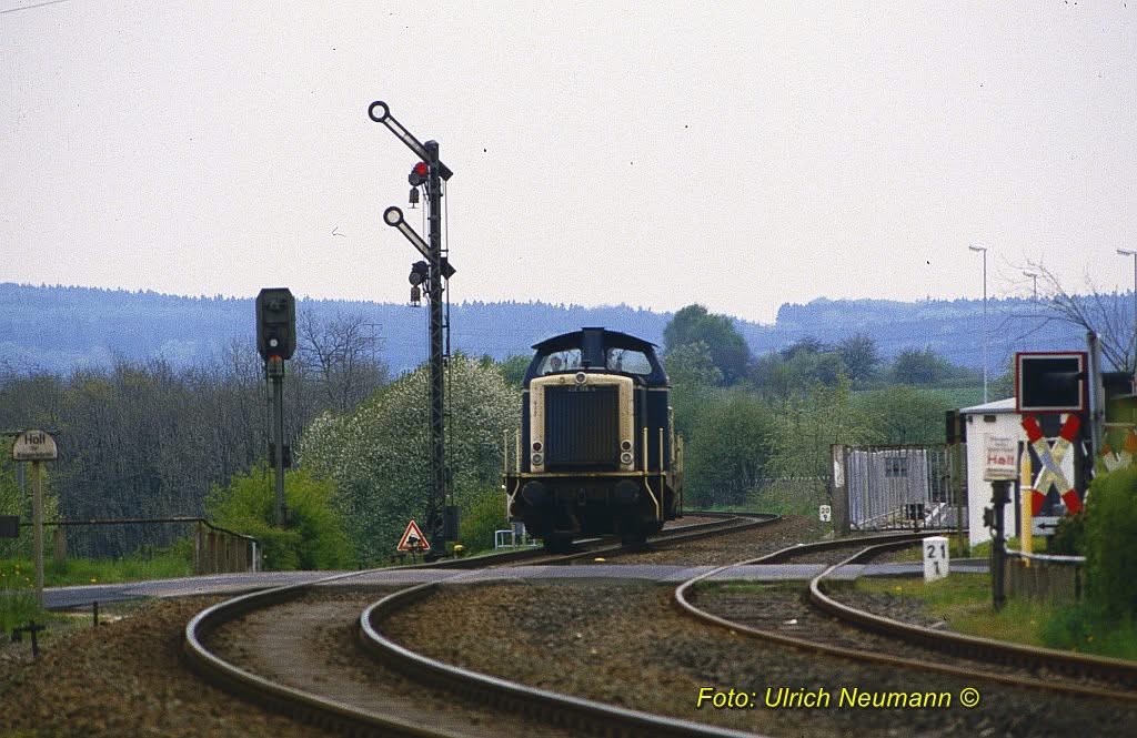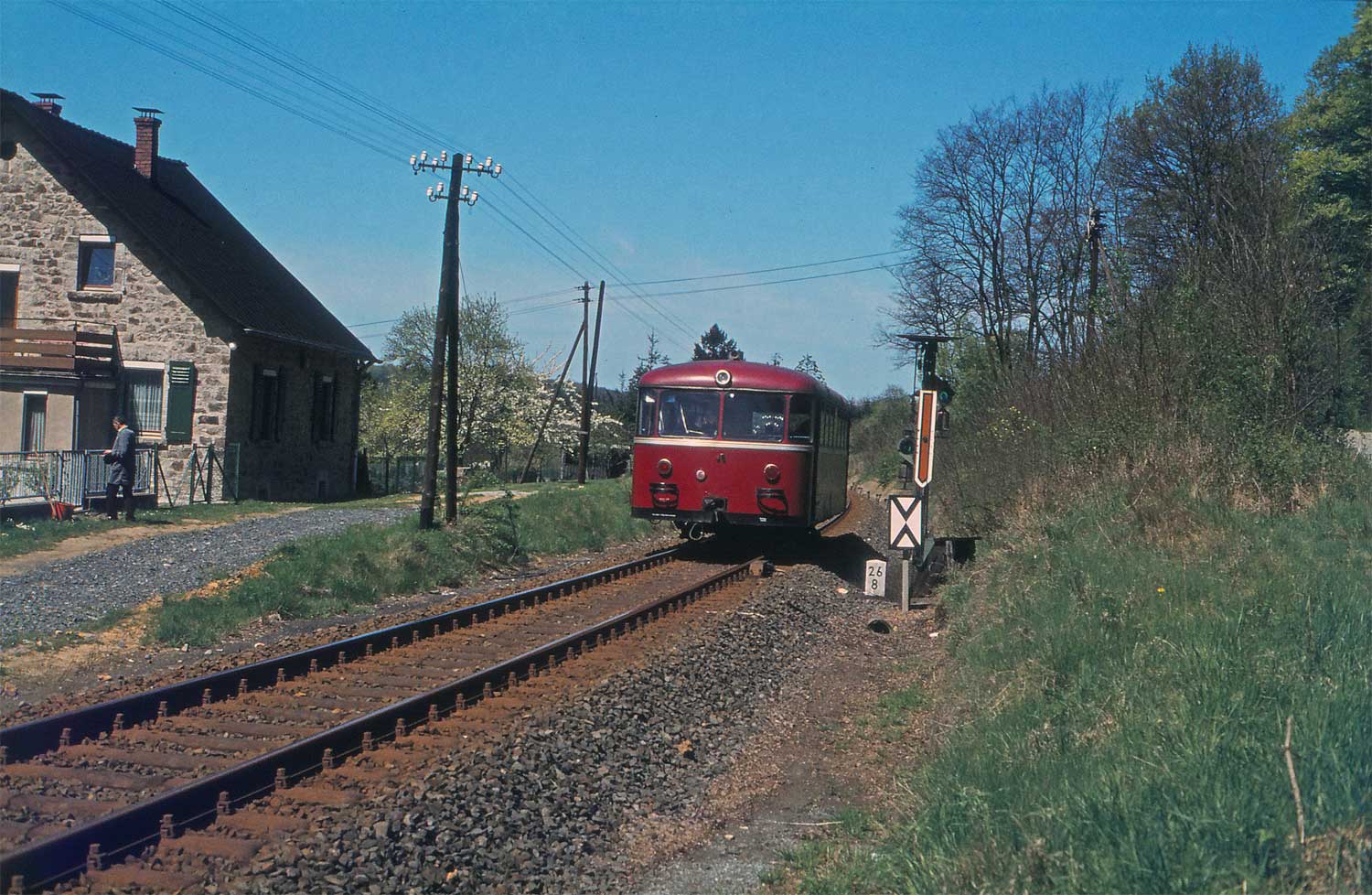 Am 14. Mai 1980 lungerte ich gegen 8.35 Uhr mal wieder mit der Kamera an der Strecke von Altenkirchen nach Siershahn südöstlich des Bahnhofs Seifen an der Brücke über den Holzbach herum.