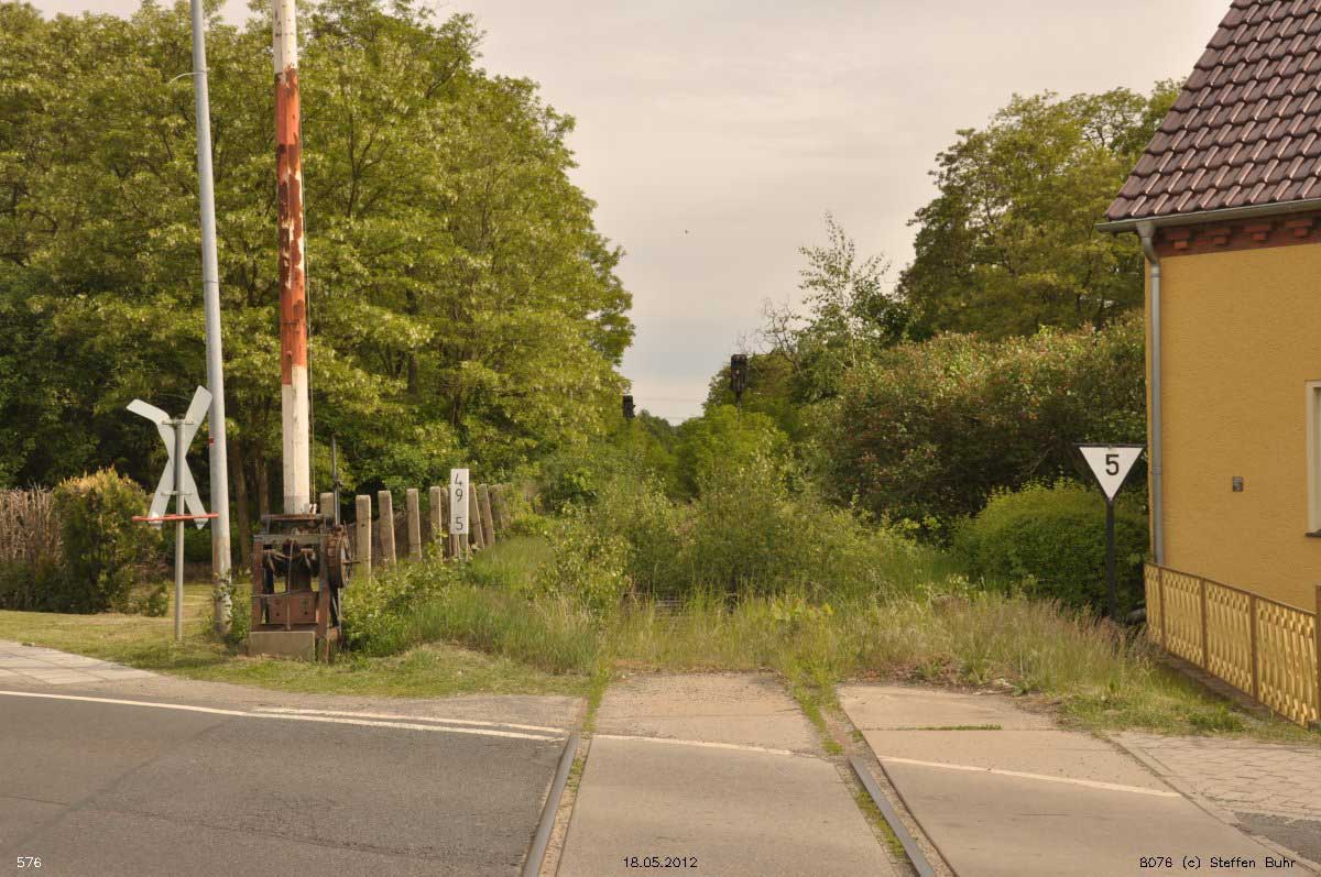 Luckau-Uckro | 49,40 | km 76,00 der Strecke [Berlin Anhalter Bf (bis 1882 Berlin Dresdner Bf) 0,01] - Abzw Berlin-Mariendorf 6,87 - Elsterwerda 122,75 - ehemalige preußisch-sächsische Landesgrenze km 124,56 = km 50,36 - Großenhain Berliner Bf 33,52 - Dresden-Friedrichstadt 0,26 (6135/6248) |