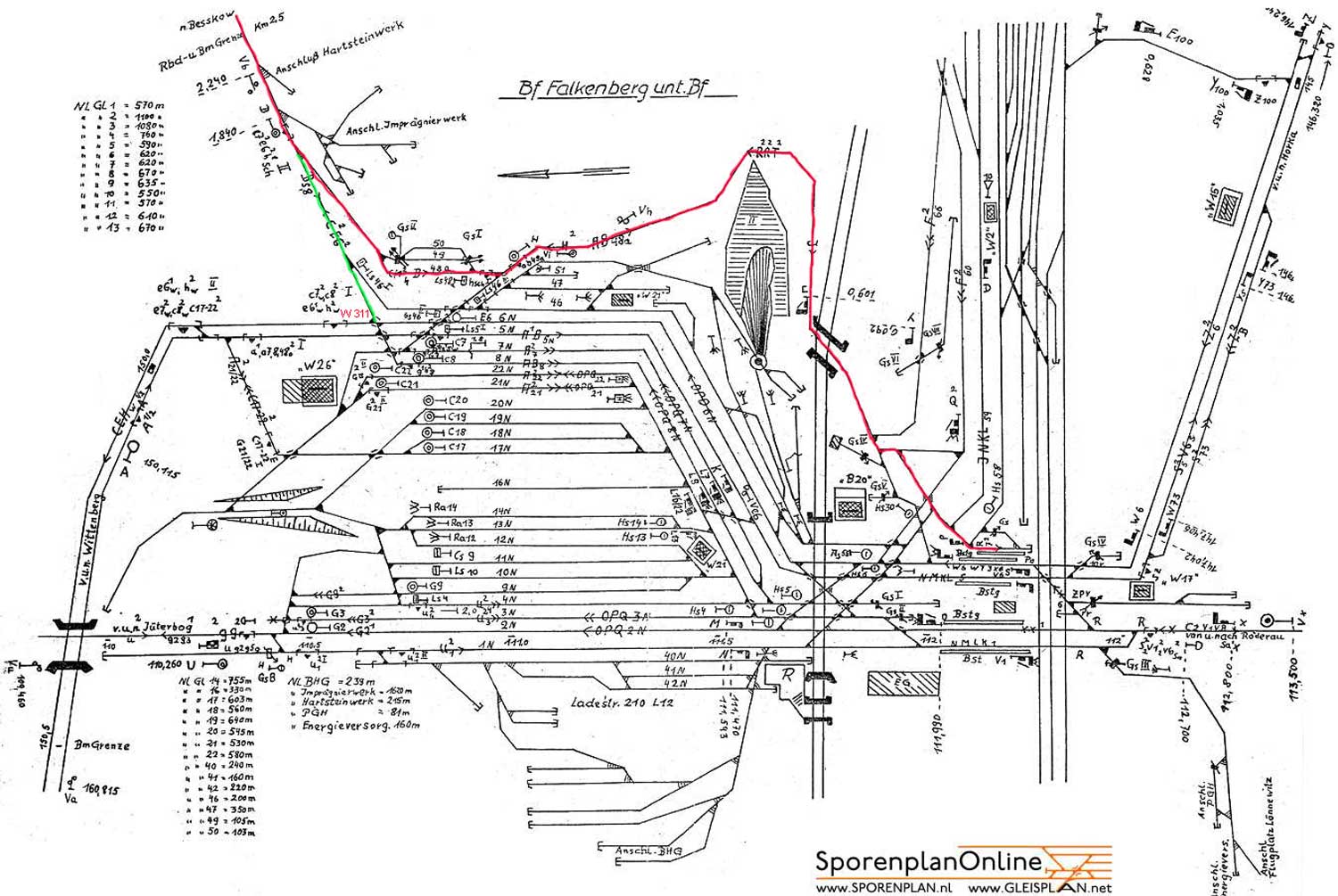 Falkenberg (Elster) (unten) | 0,31 | km 111,94 der Strecke (Berlin Anhalter Bf -0,07) - Jüterbog 62,82 - Falkenberg 111,94 - Röderau 140,87 - Abzw. Röderau Bogendreieck 141,96 (mit Zweigstrecke von Röderau 140,87 nach Abzw. Zeithain Bogendreieck 142,06) |