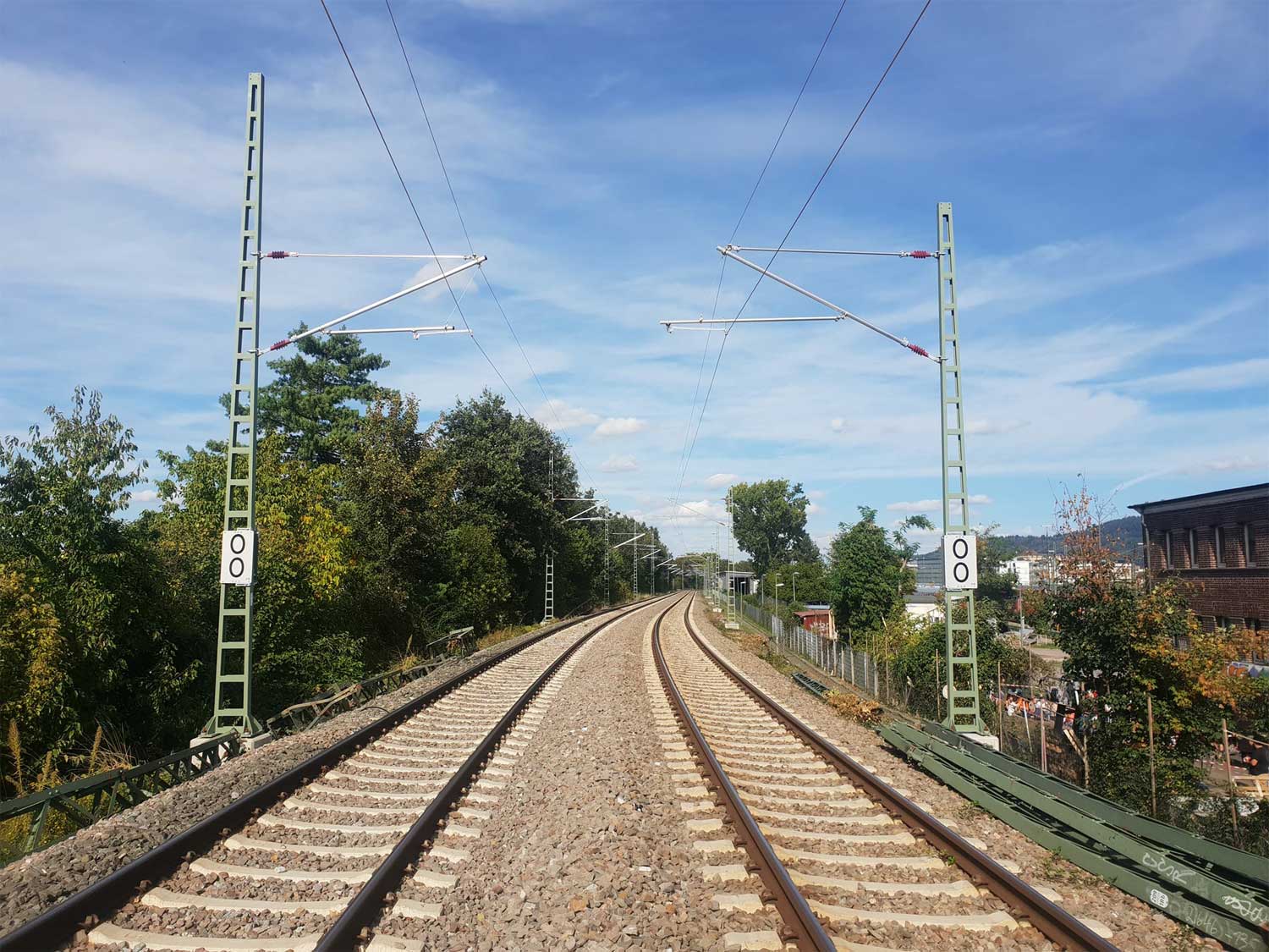 Freiburg (Breisgau) Hbf | -1,52 | km 208,32 der Strecke Mannheim Hbf 0,0 - Heidelberg Hbf 17,49 = 19,10 - Bruchsal 51,63 - Karlsruhe Hbf 72,90 - Rastatt 96,50 - Offenburg 145,48 - Freiburg (Breisgau) Hbf 208,32 - Basel Bad Bf 270,69 - Singen (Hohentwiel) 384,08 - Konstanz 414,34 - Grenze Deutschland/Schweiz 414,83 (Strecke von Winterthur und Strecke von Zürich HB) (Streckennummer: 4000) |