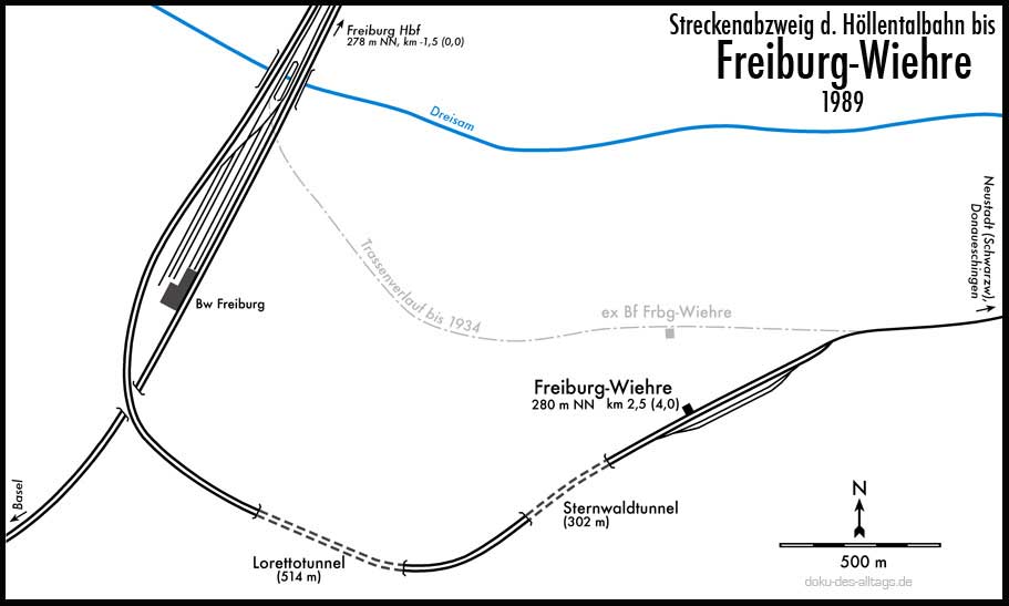 Ursprünglich zweigte die Höllentalbahn unmittelbar nach der Überquerung der Dreisam ab. Mit der Zeit wurde es eng. Die Bebauung nahm zu, es gab ausschließlich schienengleiche Übergänge. Bereits 1903 gab es die ersten Überlegungen zur Verlegung der Strecke, jedoch erst 1934 kam es zur Realisierung. Die neue Strecke vom Hauptbahnhof zum ebenfalls neu errichteten Bahnhof Freiburg-Wiehre wurde als zweigleisige Hauptbahn ausgeführt, die in großzügigem Bogen ums südliche Freiburg herumführt und dabei 2 Tunnels durchläuft. Dadurch wurde die Höllentalbahn um 1,78 km länger als bisher. Es blieb jedoch im weiteren Streckenverlauf bei der ursprünglichen Kilometrierung, so daß die Strecke im Freiburger Hbf bei km - 1,52 beginnt.