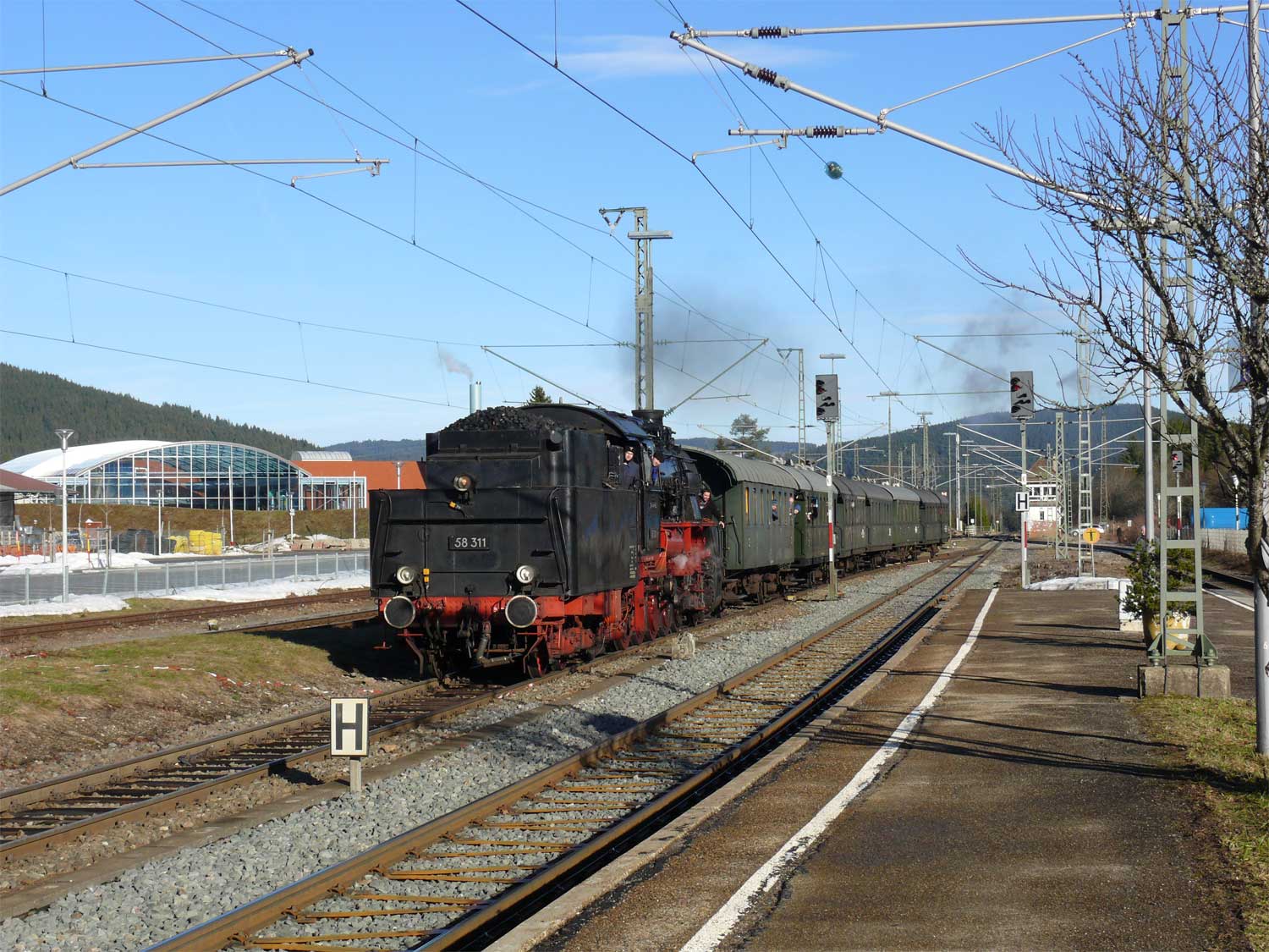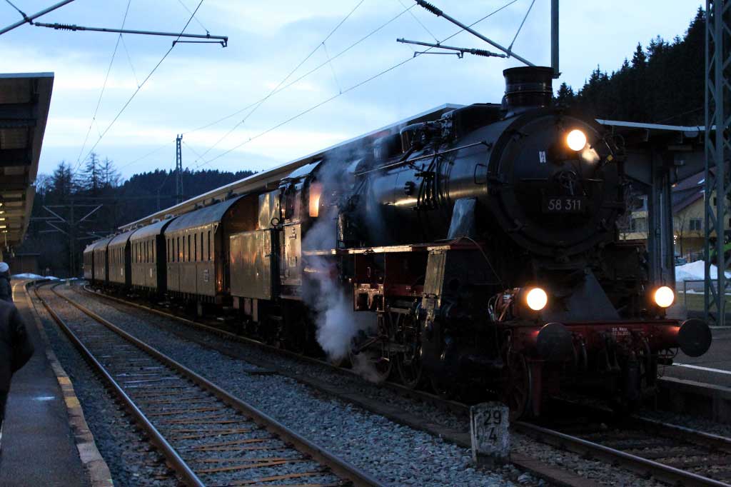 km 29,4 in Titisee - 58 311 am 28.12.2012 beim ersten Winterdampftag auf der Dreiseenbahn