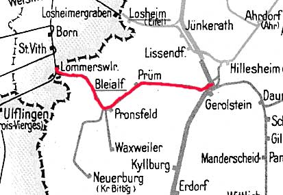 Lommersweiler | 52,87 | km 95,06 der Strecke Stolberg (Rheinl) Hbf 0,0 - Walheim (b Aachen) 13,24 - Raeren 19,11 - Monschau 45,43 - Weywertz 66,50 - Born (Eifel) 82,89 - St. Vith 88,87 - Lommersweiler 95,06 - Lengeler 108,44 - Reichsgrenze Deutschland/Luxemburg 111,41 (1944) |