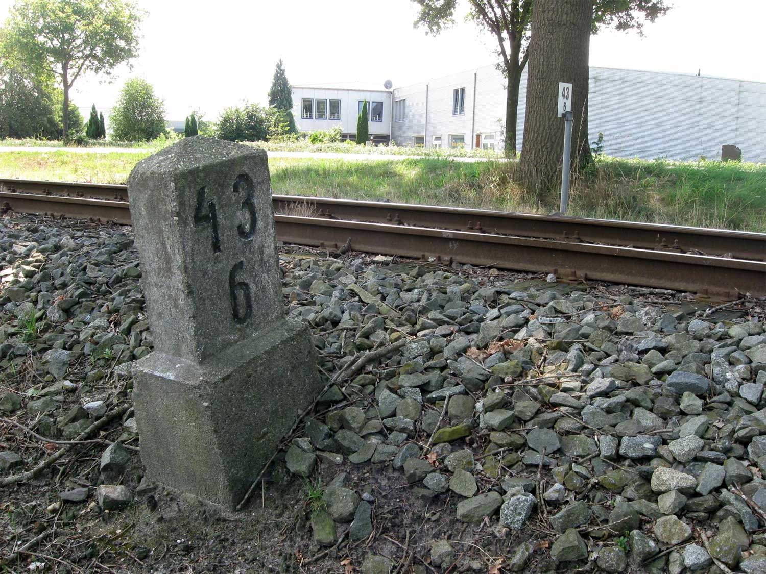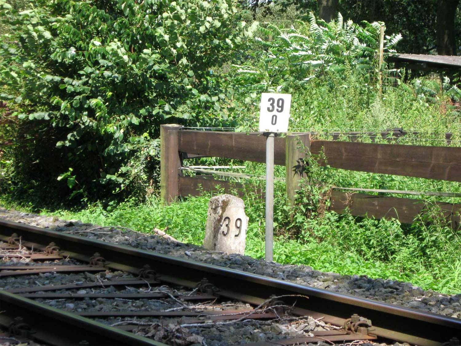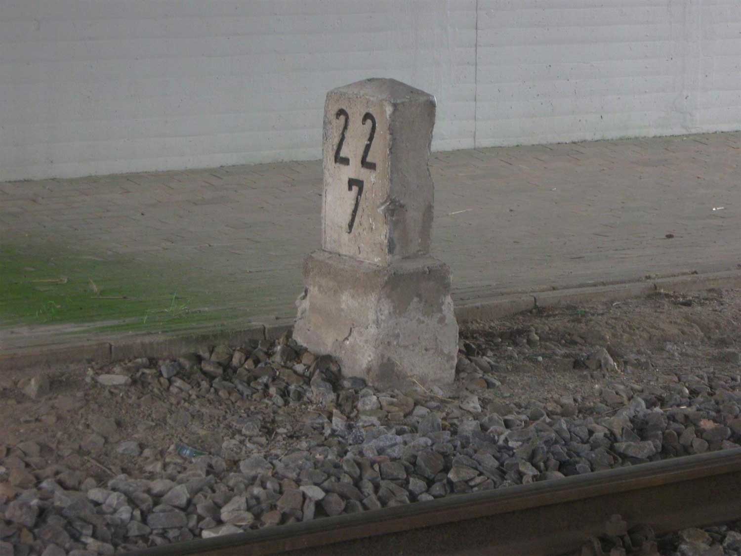 Der Kilometerstein wurde vom Bahnhofseigentümer aufgestellt.
