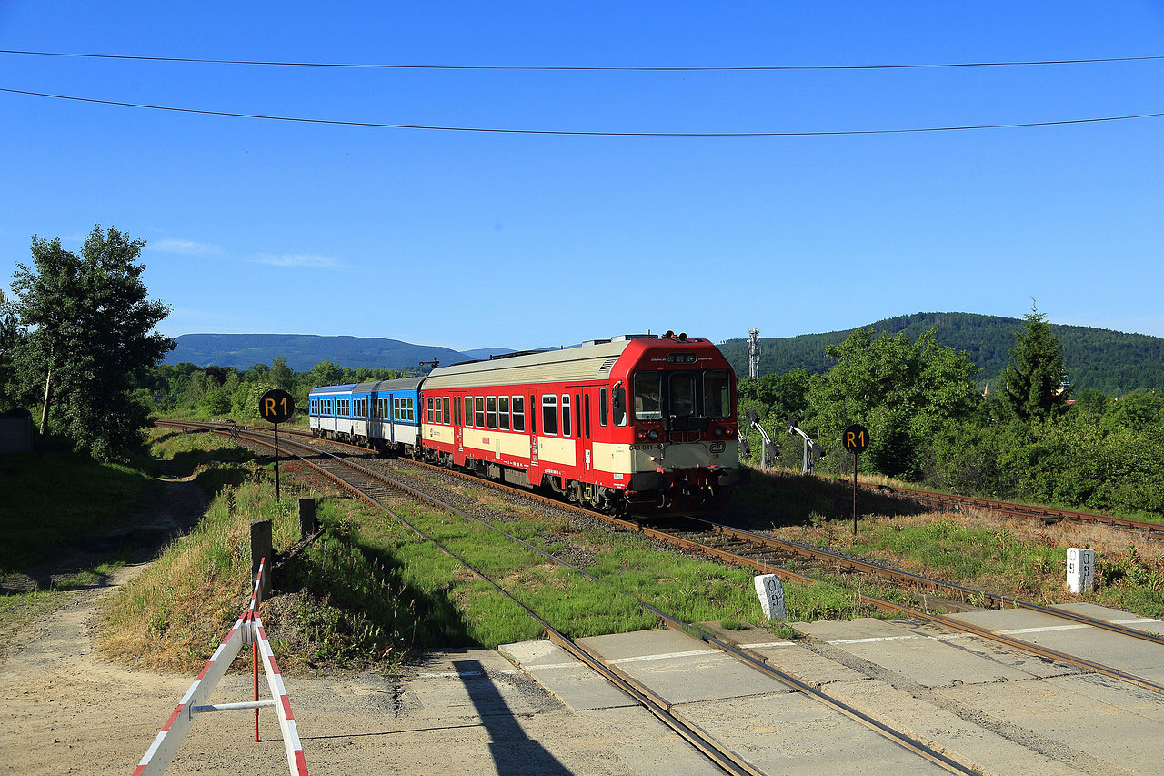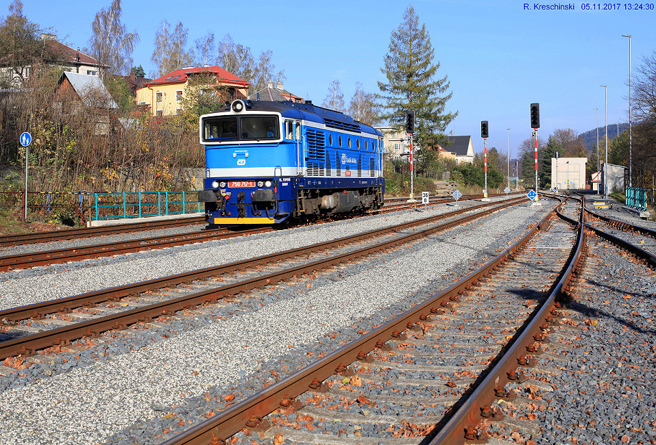 Der Zug der CD kommt von Hanušovice (Hannsdorf) - Jeseník (Freiwaldau-Gräfenberg), befindet sich hier auf polnischem Gebiet und und fährt nach dem Kopfmachen auf dem daneben liegenden Gleis zurück auf tschechisches Gebiet in Ri Jeseník (Freiwaldau-Gräfenberg) - Hanušovice (Hannsdorf).