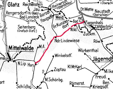 Hannsdorf 0,0 - Freiwaldenau-Gräfenberg 35,75 - Grenze Sudetengau/Schlesien 52,44 - Ziegenhals Hbf 57,15 (1943)