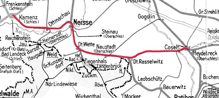 Heydebreck (Oberschles) 0,0 - Deutsch Rasselwitz 33,50 - Neisse 74,82 - Kamenz (Schles) 112,84 (1940)