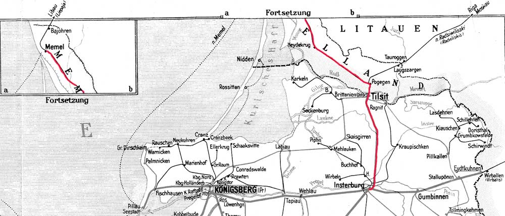 Insterburg 0,0 - Tilsit 53,82 - Grenze Ostpreußen/Memelgebiet 54,763 - Memel 146,14 - Memel Hafen 148,21