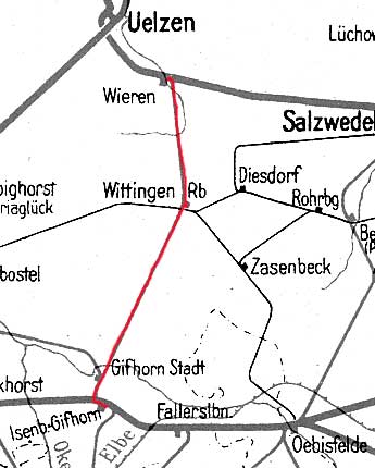 km 28,8 der Strecke Beetzendorf Süd 0,0 - Rohrberg 3,9 - Diesdorf 17,2 - Wittingen 28,8 (Altmärkische Eisenbahn-AG)