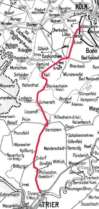 Kalscheuren (Hürth-Kalscheuren) 0,64 - Euskirchen 30,06 - Jünkerath 82,97 - Gerolstein 101,47 - Ehrang 163,46