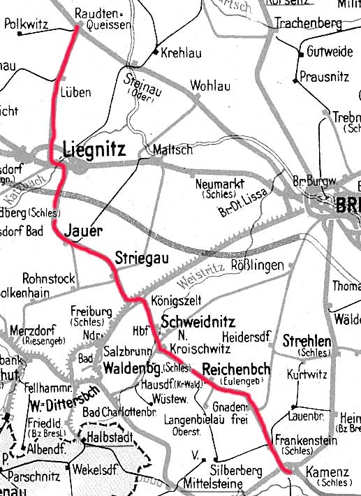 Kamenz (Schles) 0,0 - Königszelt 59,75 - Liegnitz Hbf 106,54 - Raudten-Queissen 145,20 (1940)