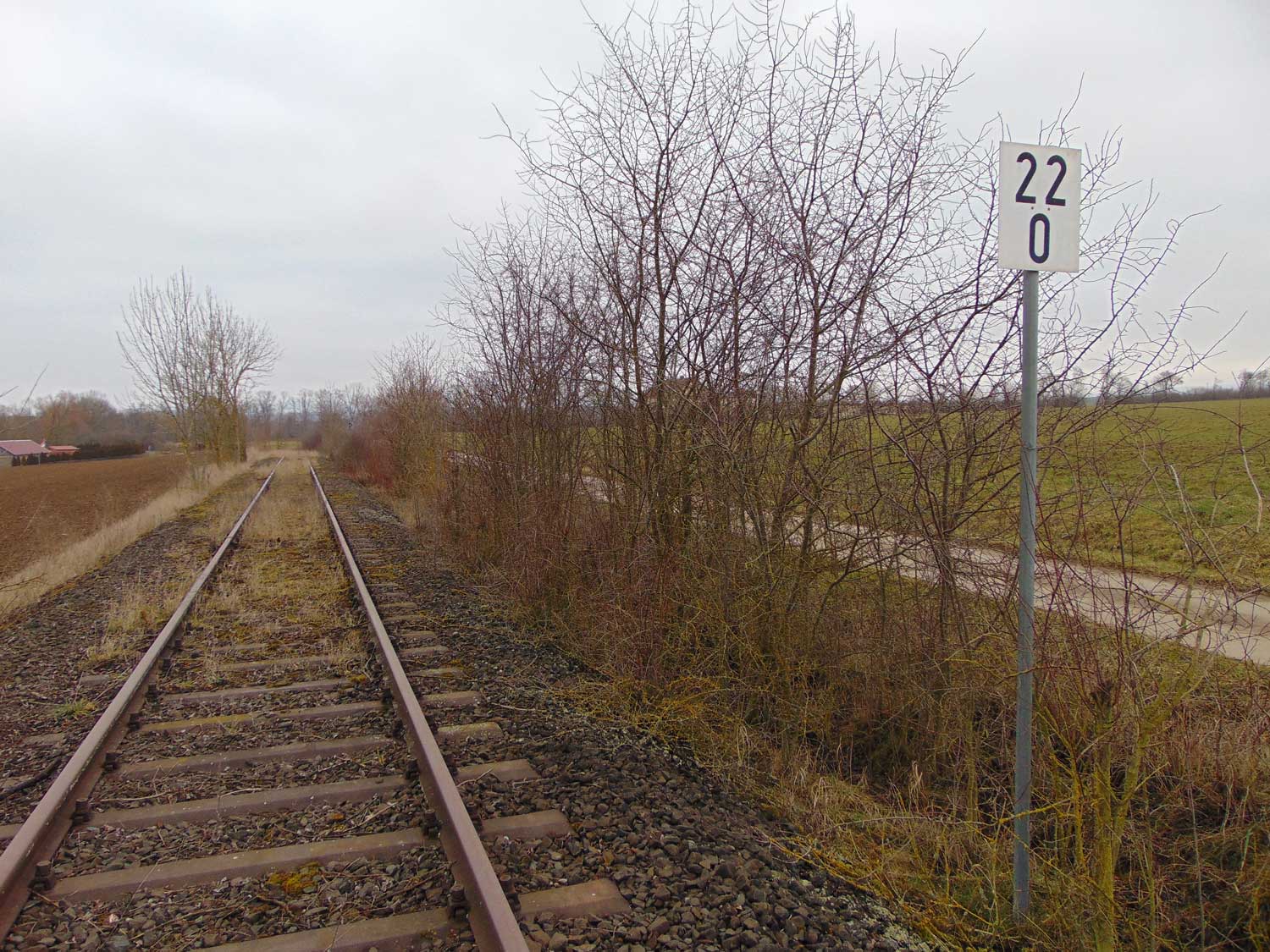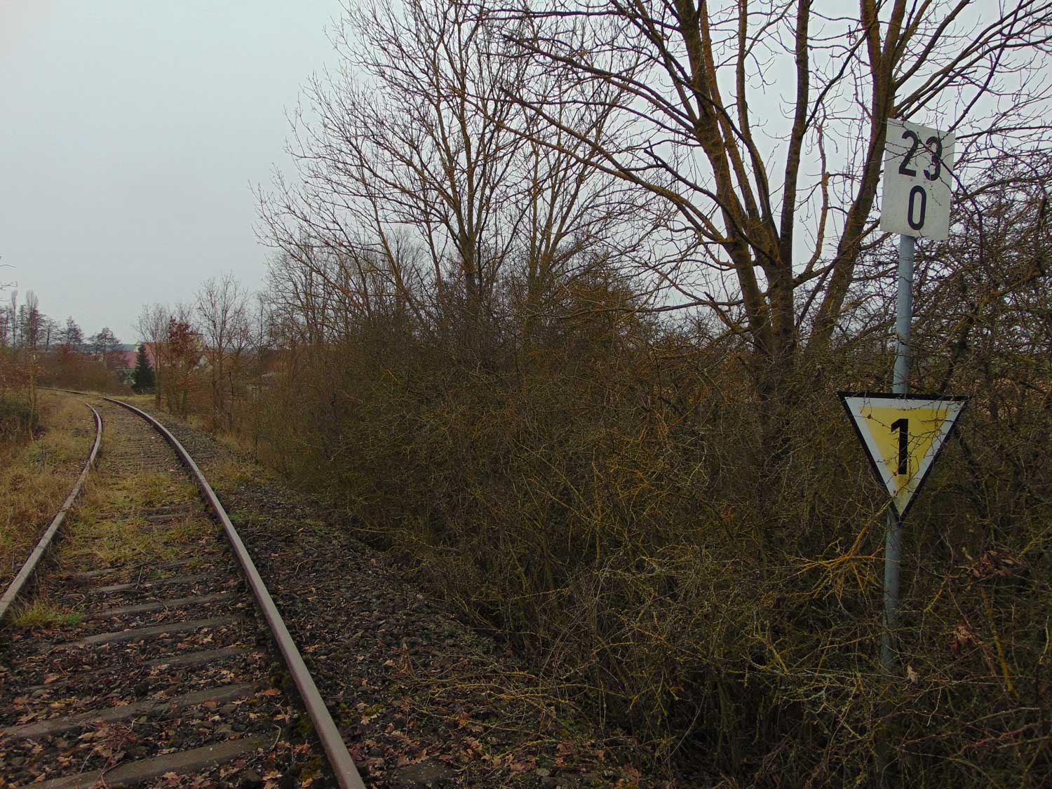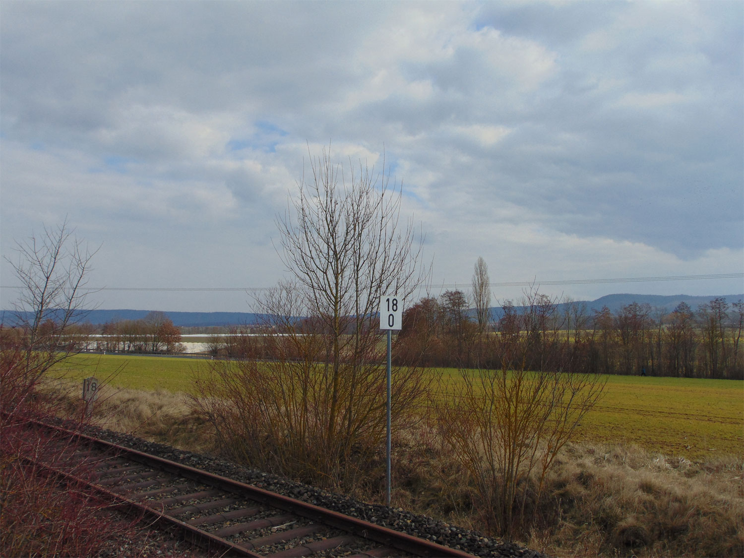Dahinter vom Schnee verdeckt km 56,6 der Strecke Bamberg 0,0 - Schweinfurt Hbf 56,89 - Rottendorf 92,15