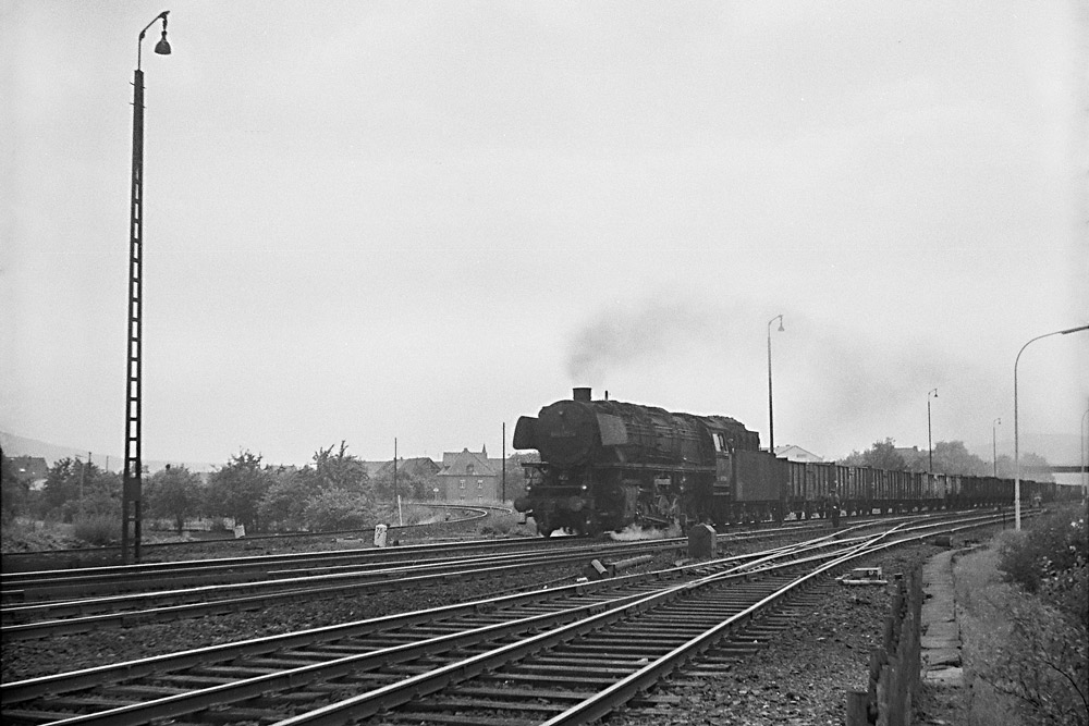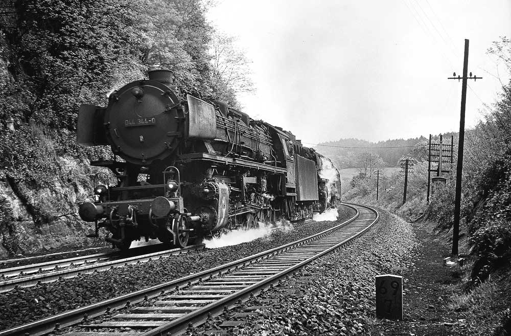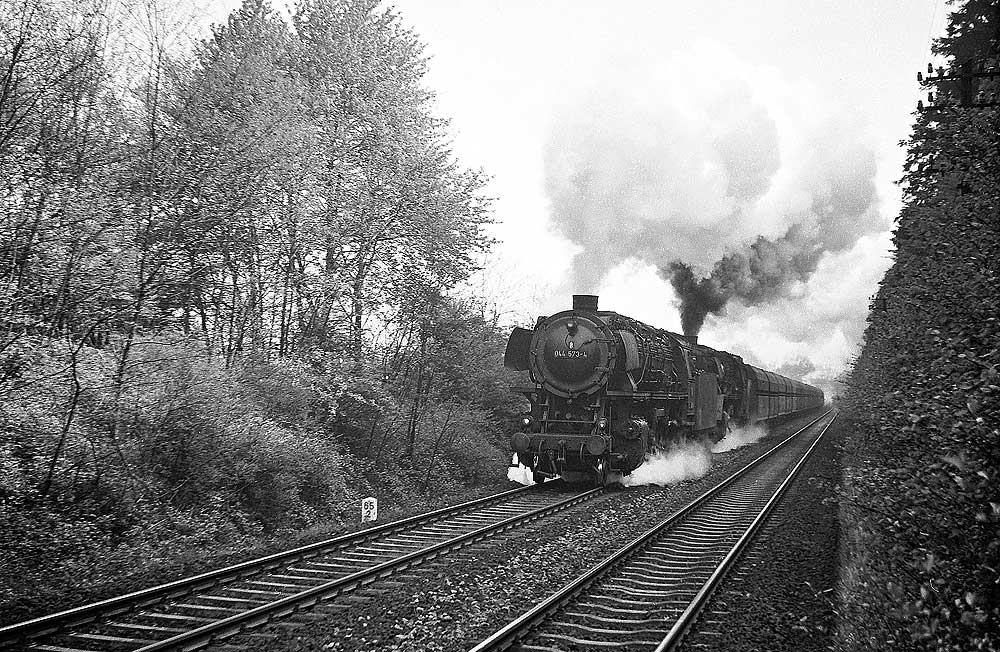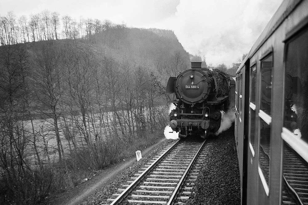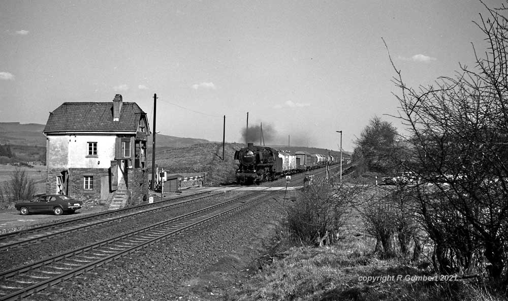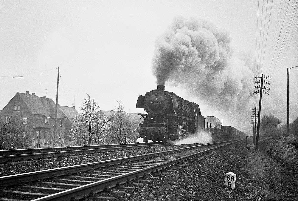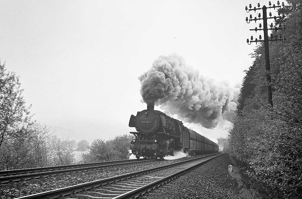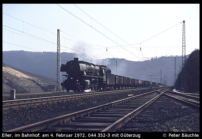 044 482 des Bw Ehrang mit ihrem Güterzug. Die letzte Untersuchung lautete „Sr 7.5.67“, am 08.01.74 ging sie zum Bw Gelsenkirchen-Bismarck um dort nach etwa einem Jahr, am 29.01.75 auf Z gestellt und am 18.05.75 ausgemustert zu werden.