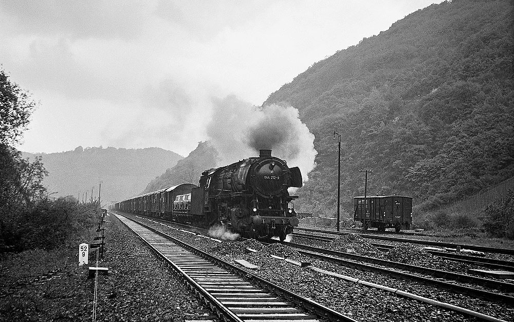 044 212- des Bw Ehrang, als sie mit ihrem Güterzug in km 66,5 bei Bengel vorbei eilte.