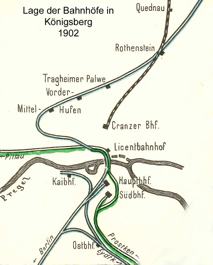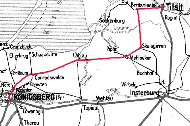 Die Kilometrierungssprünge in Königsberg (Pr) Hbf ergaben sich nach dem Abschluss des Umbaues im Jahr 1929 an Stelle der bisherigen Bahnhöfe Königsberg Süd und Königsberg Ost.