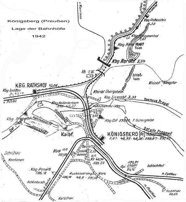 Königsberg (Pr) Hbf | 2,07 | km 591,15 (kommend von Berlin Schlesischer Bf)/km 588,87 (gehend nach Eydtkuhnen - Reichsgrenze) der Strecke Berlin Schlesischer Bf 0,0 - Küstrin Neustadt 84,72 - Kreuz 187,28 - Schneidemühl Pbf 245,66 - Dirschau 426,10 - Elbing 472,55 - Königsberg (pr) Hbf 591,15 (kommend)/588,87 (gehend) - Insterburg 680,25 - Eydtkuhnen 741,73 - Reichsgrenze 742,33 |