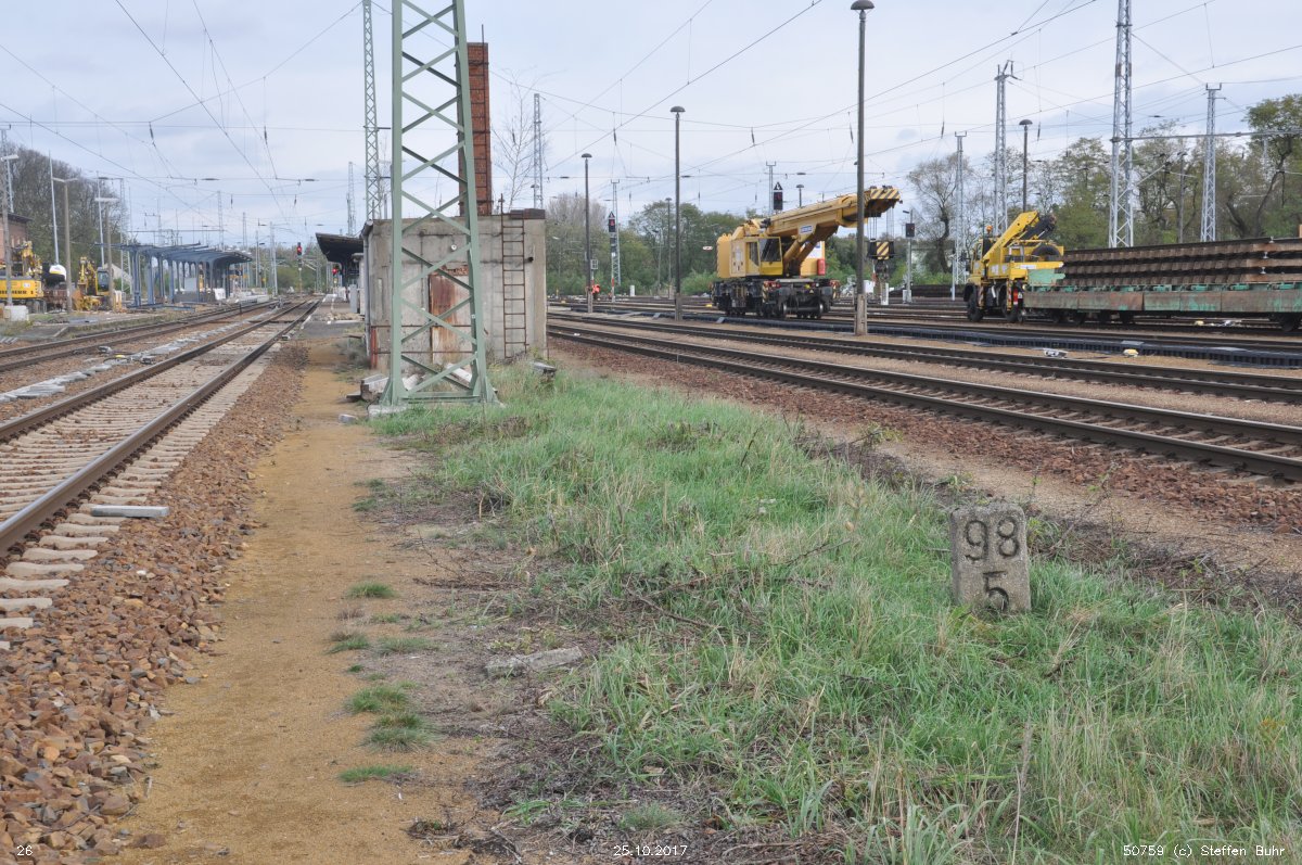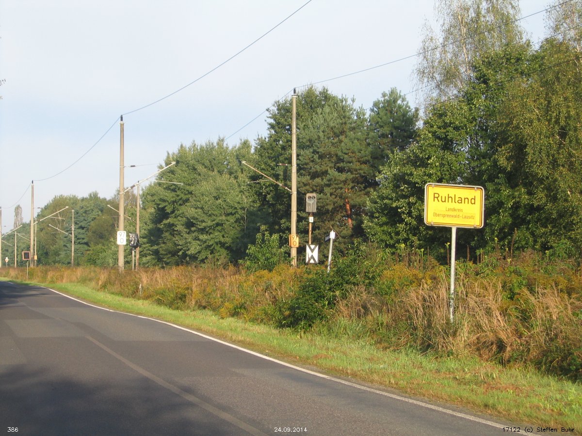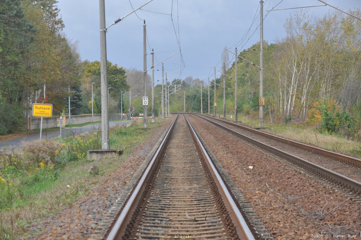 Ruhland | 98,32 | km 32,92 der Strecke Großenhain Cottb. Bf 0,0 - Senftenberg 45,29 - Cottbus 79,67 - Frankfurt (Oder) Pbf 152,85 (Personenzuggleise)/152,79 (Güterzuggleise) |