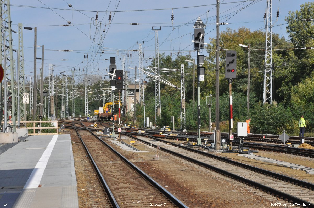 Großenhain Cottb. Bf 0,0 - Senftenberg 45,29 - Cottbus 79,67 - Frankfurt (Oder) Pbf 152,85 (Personenzuggleise)/152,79 (Güterzuggleise)