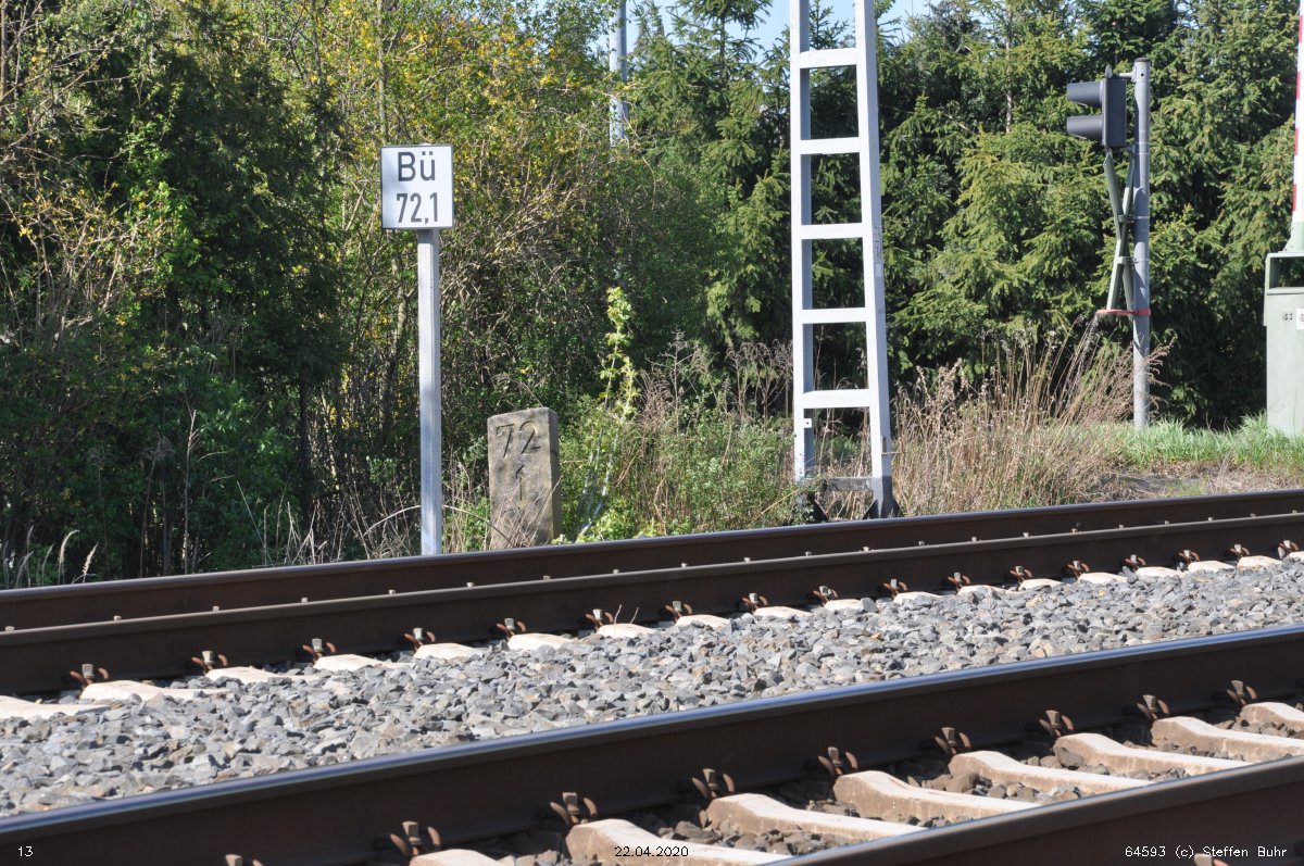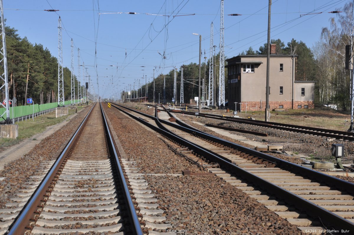 Falkenberg (Elster) (unten) | 148,18 | km 111,94 der Strecke (Berlin Anhalter Bf -0,07) - Jüterbog 62,82 (Abzw. von Strecke 66) - Falkenberg 111,94 - Röderau 140,87 - Abzw. Röderau Bogendreieck 141,96 (mit Zweigstrecke von Röderau 140,87 nach Abzw. Zeithain Bogendreieck 142,06 |