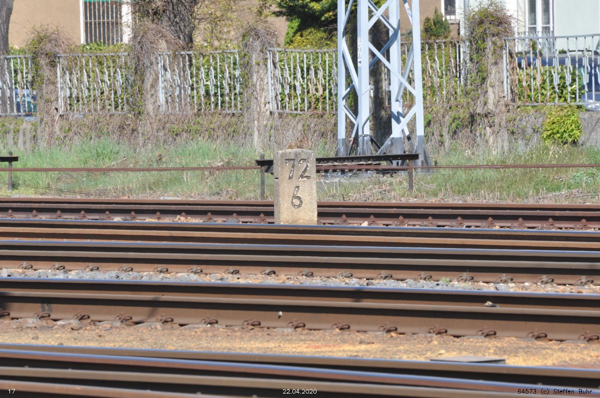Roßlau (Elbe) | 233,67 | km 17,94 der Strecke (Biederitz 0,68 - Güterglück 25,87 - Landesgrenze Preußen/Anhalt km 30,320) = km 0,0 - Dessau Hbf 22,96 - Bitterfeld 48,51 - Leipzig Hbf 81,26 |