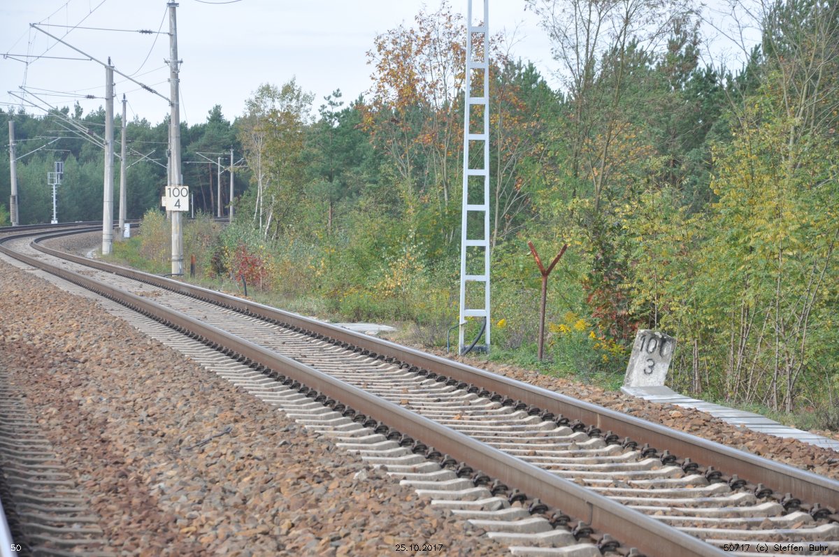 km 100,3 (Stein) und km 100,4 (Tafel) zwischen Ruhland und Lauchhammer Süd