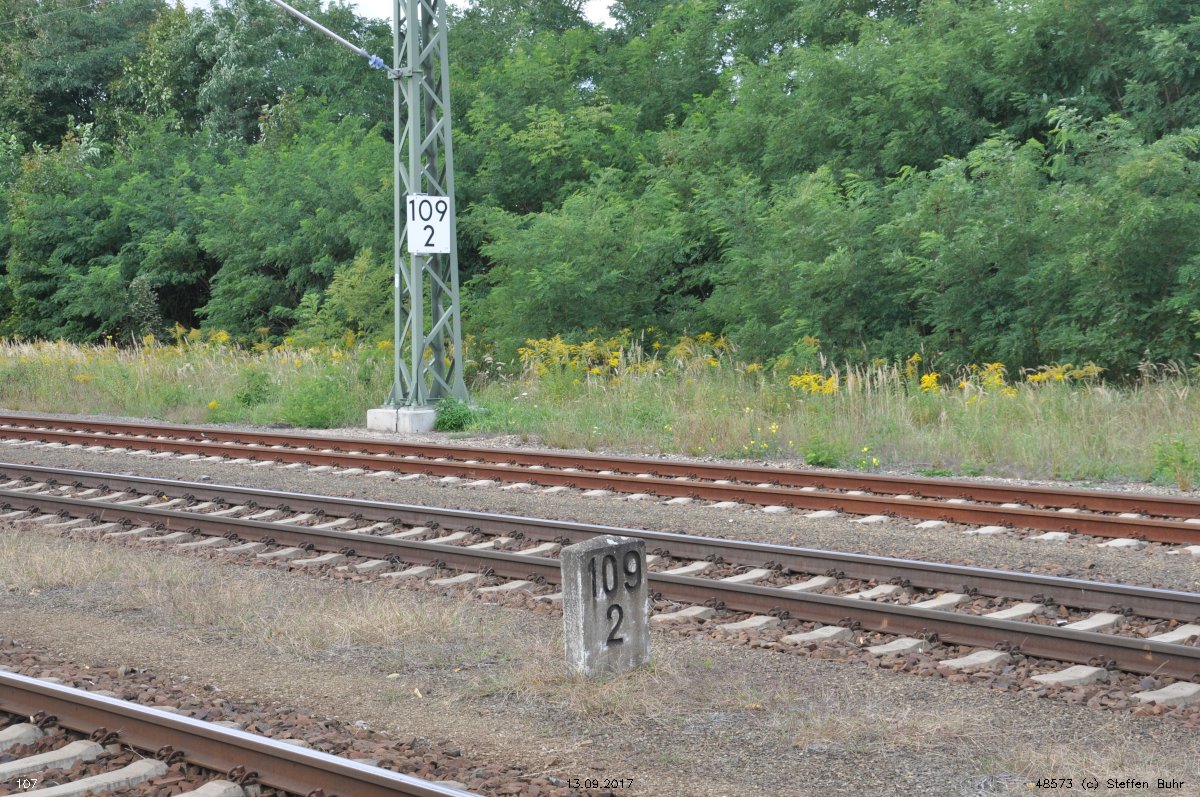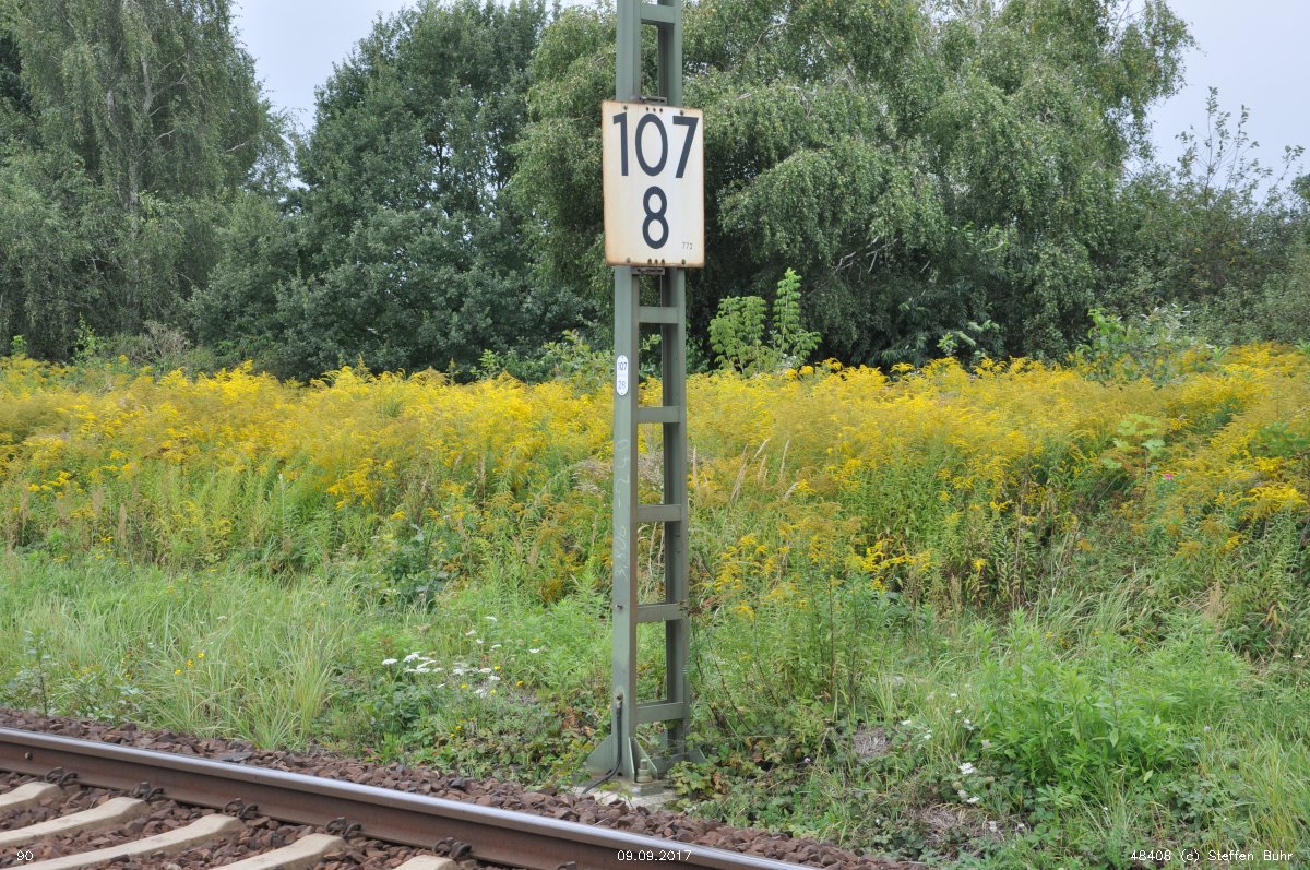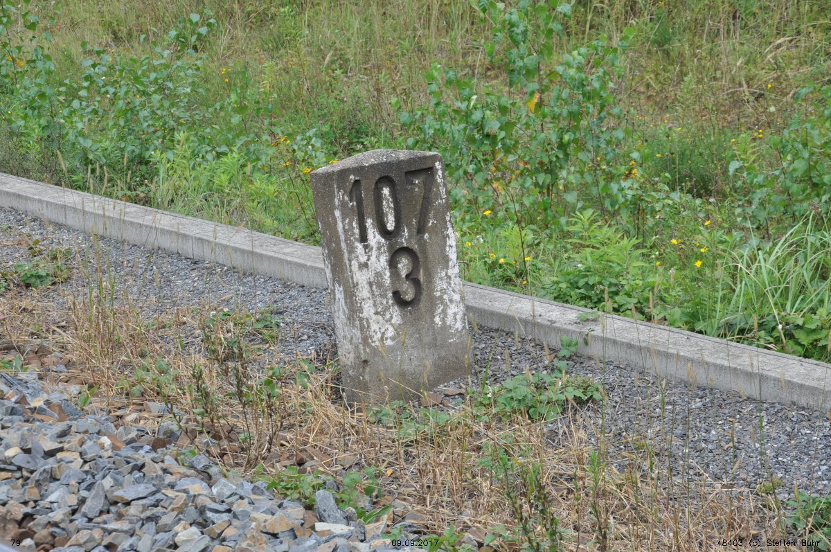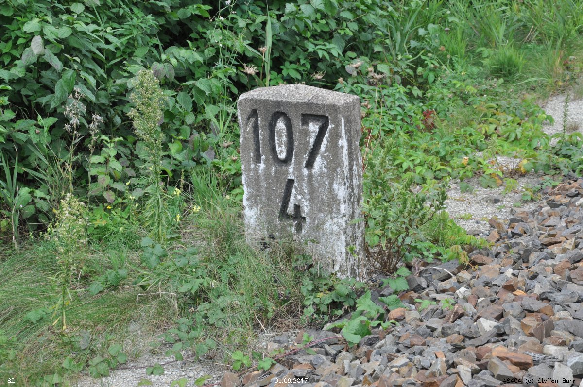 km 107,3 (Stein) und km 107,4 (Stein und Tafel) zwischen Lauchhammer Süd und Lauchhammer West